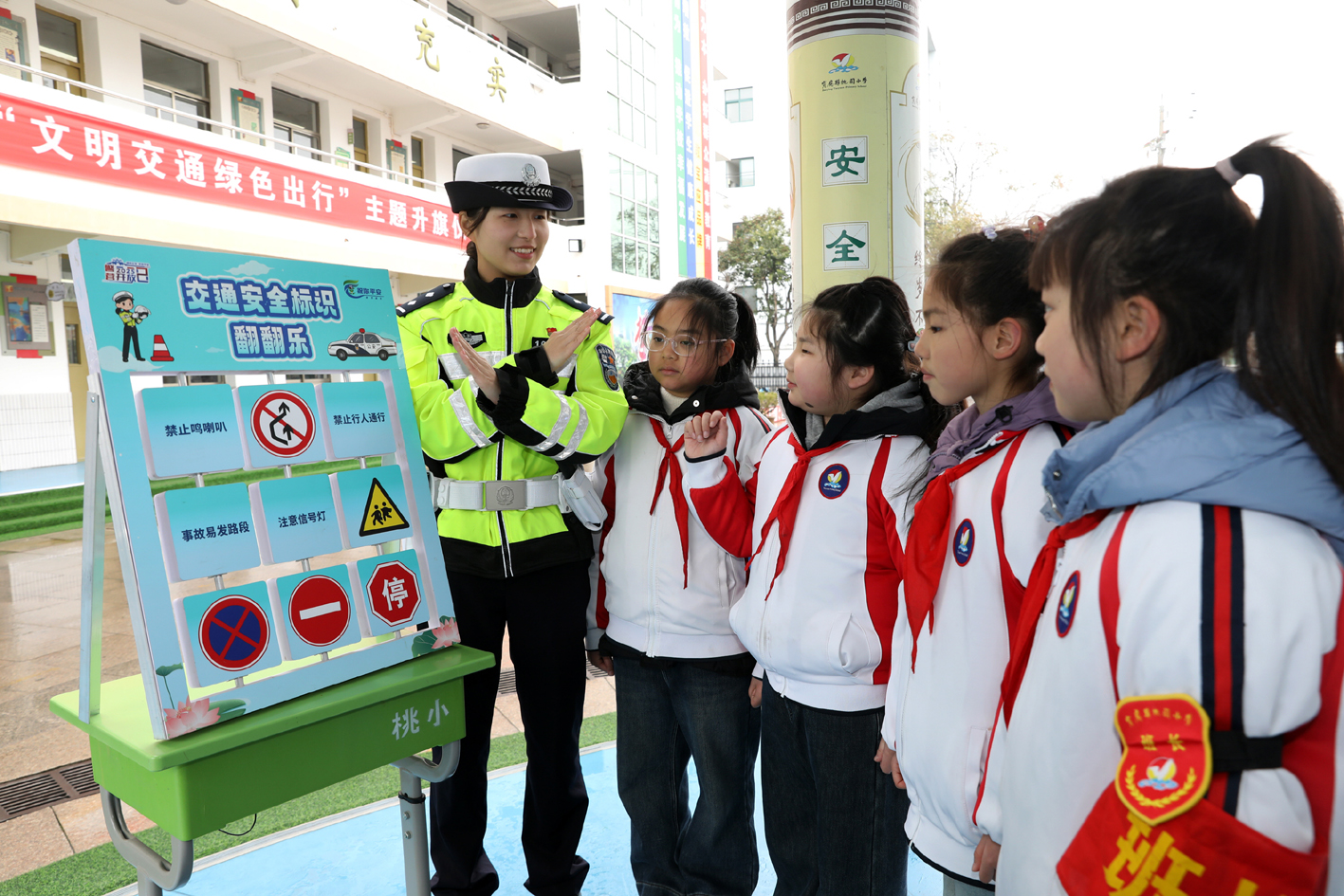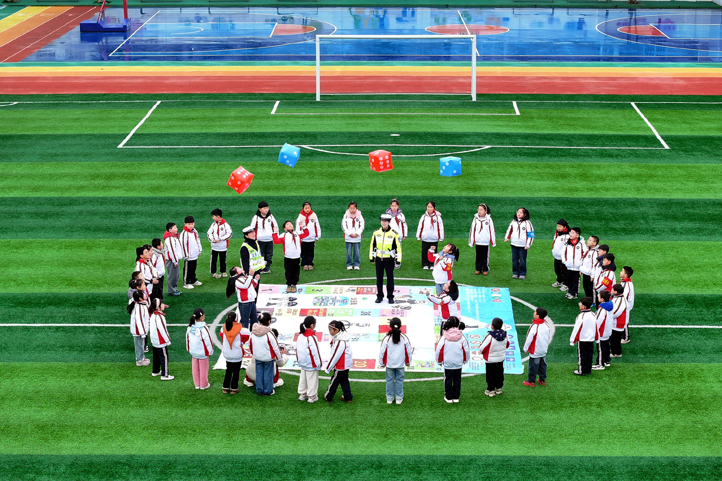 3月16日,在宝应县桃园小学,民警与学生开展交通飞行棋互动,学习交通安全知识。当日,宝应县公安局交管大队民警走进宝应县桃园小学,开展“文明交通绿色出行”主题安全教育活动。通过交通安全课、讲解“一盔一带”、识别交通标识、趣味交通飞行棋等形式,为学生普及安全知识,增强学生的文明交通意识。 通讯员 沈冬兵 记者 司新利 摄