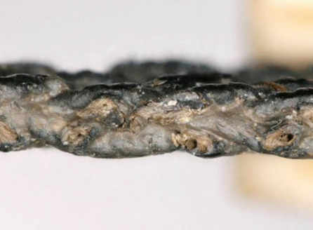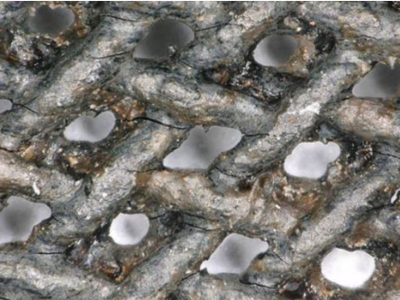 经研究确认,该漆纱冠是由直径约为0.3毫米的织线编织而成,织造密度约为12×14股/平方厘米,且能看出在织造过程中,是两根线组成一组,四根线组成一个织造单元,两组交叉的线相互交织,这种织造方法织造出的网状结构可以进行调整和变形。此外,根据横截面的分析图像得知,漆纱是由内层织物和外层漆膜组成,织物大部分纤维与现代苎麻的特征一致,推测漆纱是由苎麻纤维织成。