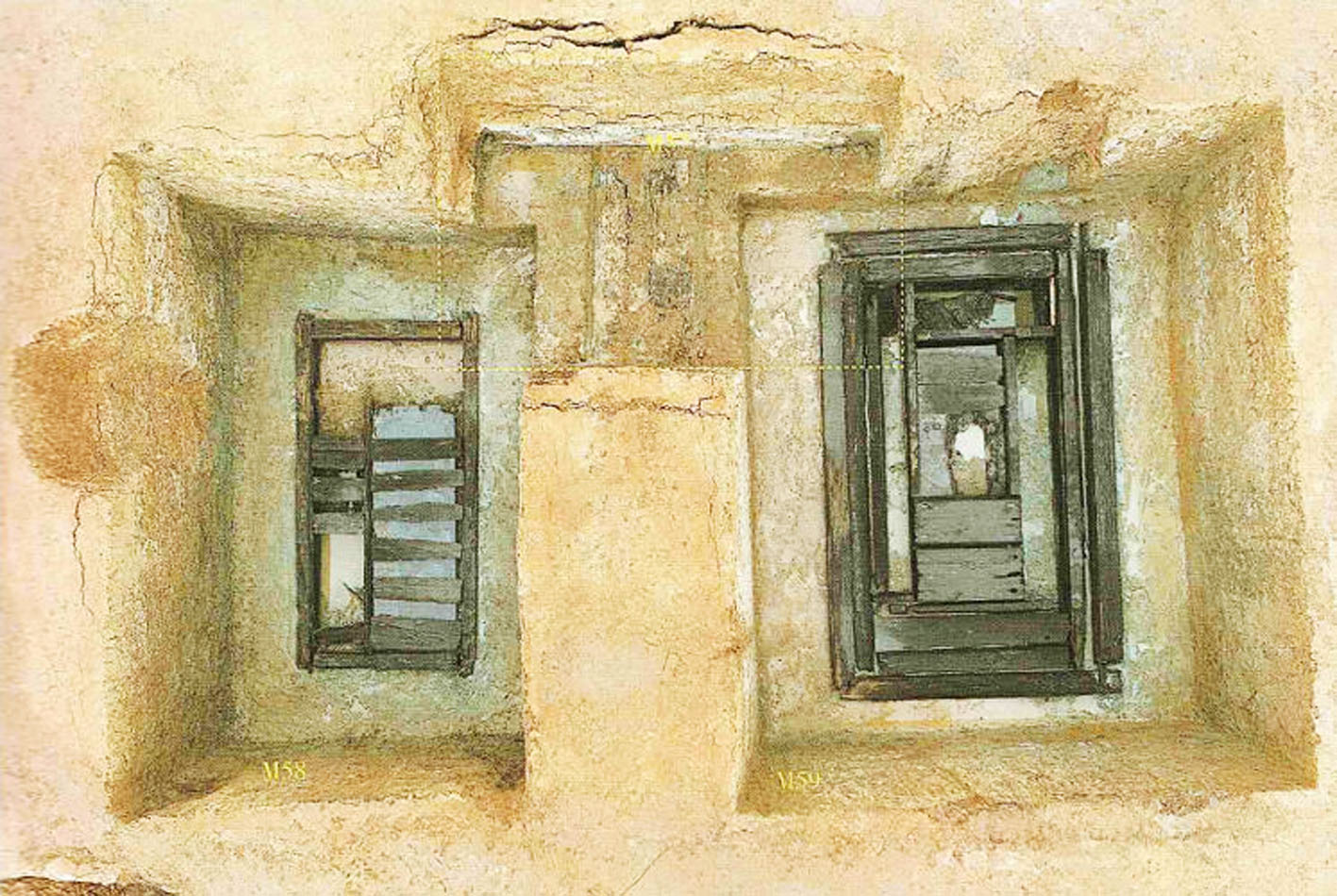 M59为男主墓葬,墓室棺椁结构清晰,为双椁一棺四箱,内棺外髹黑漆、内髹朱漆,棺内有一长方形天花板,用金、银、朱三色漆绘制有云龙纹及变形龙纹,棺内底部放置了一具长方形镂空彩绘云龙穿璧纹笭床,显示出墓主较高的社会等级地位。考古人员还在此墓中考古发掘出了“范胥奇印”玉印和“胥奇”铜印各1件。专家推测,墓主人姓名应为“范胥奇”,根据墓葬规制推断其身份应在大夫级别,且因墓中出土了铜镞、矛等兵器,认为墓主生前应具有武官身份。