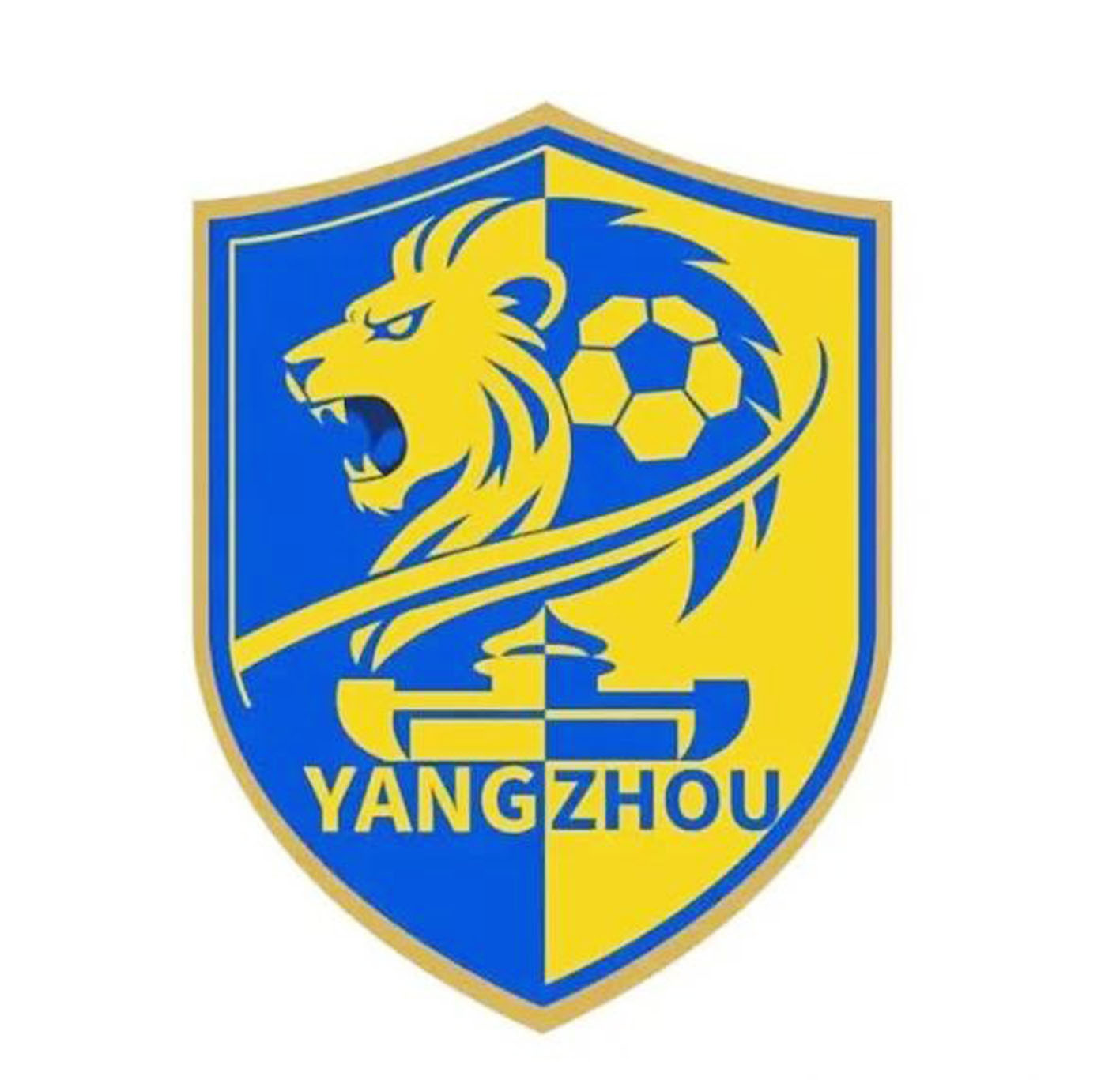 盾形寓意坚如磐石,蓝黄交织象征忠诚睿智与辉煌荣耀。整体如大运之舟扬帆,承载扬州足球梦想,乘风破浪、奔赴荣光。