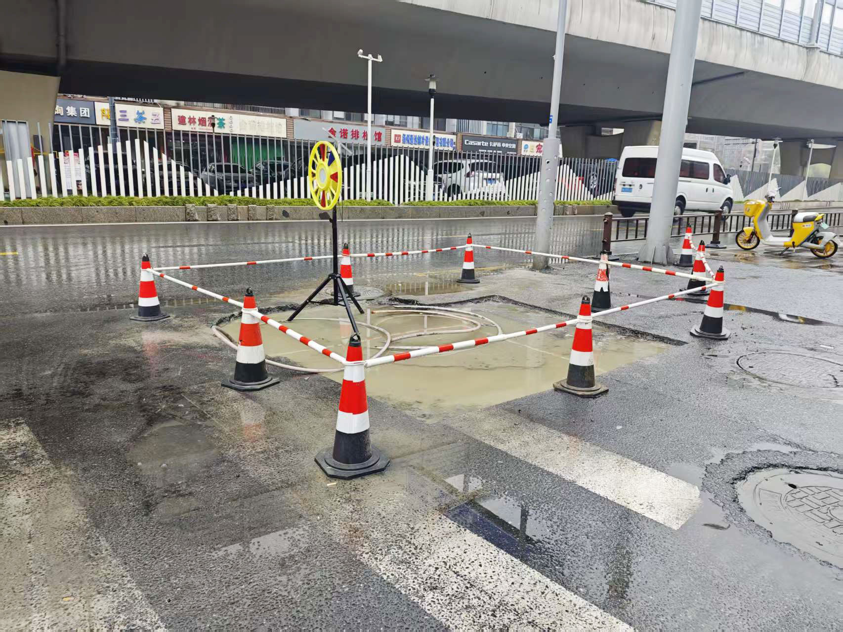 网友告诉记者,该路口位于扬子江路高架桥下方,空间比较局促,几天前有维修人员在路口围上了围挡,并将路面斑马线上切开了一个方形的坑洞。之前并没有发现这里有什么异常,不知道挖开路面是修什么?要多久才能修好?