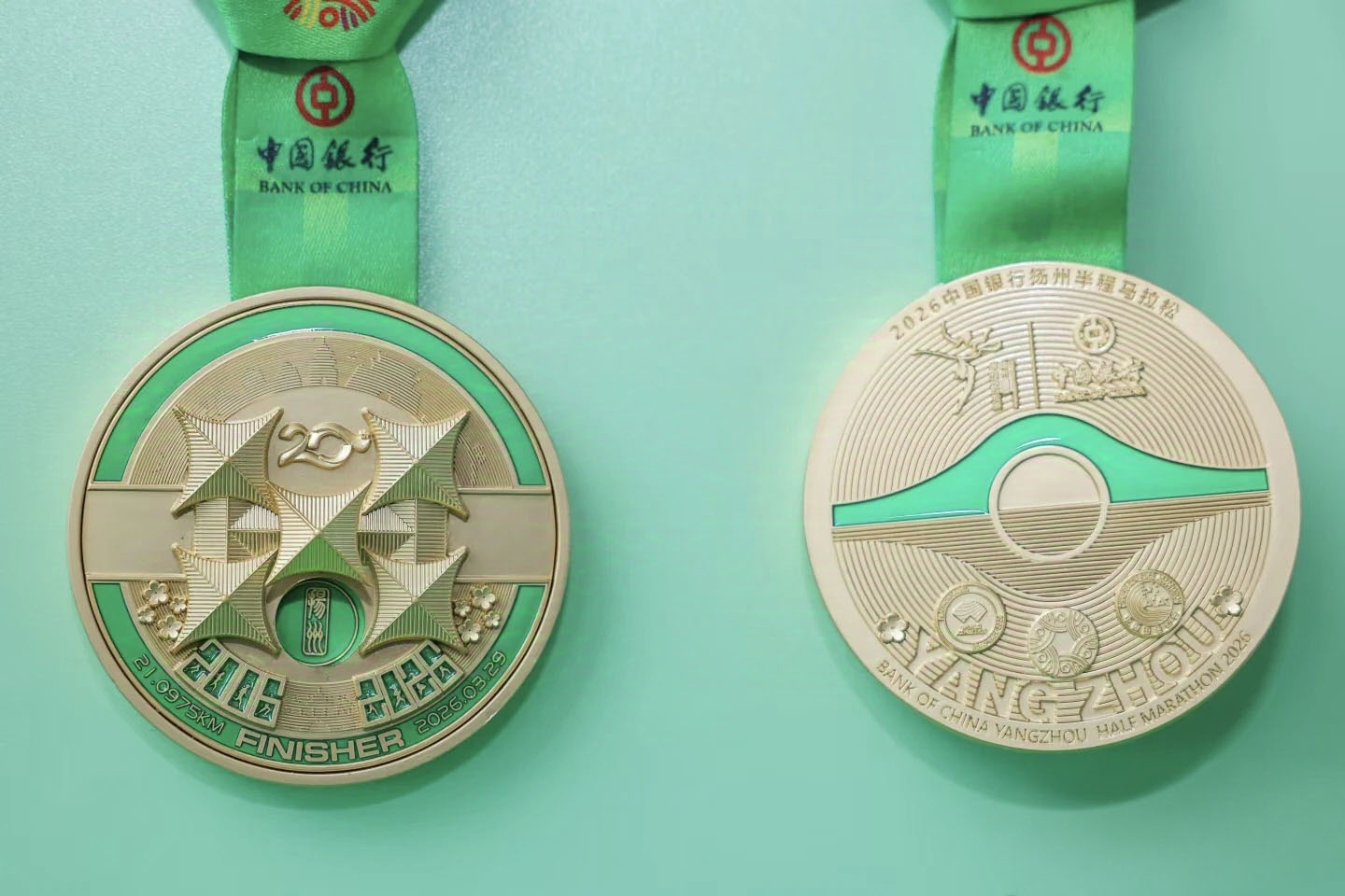 奖牌正面底部,“2006—2026”的时间刻度,“汲取了江南园林花窗的灵感,将数字化作一幅幅精致的窗景:浮雕工艺下,奔跑的运动员与扬州八景虚实相生,动静结合,寓意着移步换景,景随人动。每一个数字都是一个时空的切片,透过这扇‘时间之窗’,跑者不仅见证了自己的奔跑历程,更将扬州最美的风景与最燃的时刻定格。”