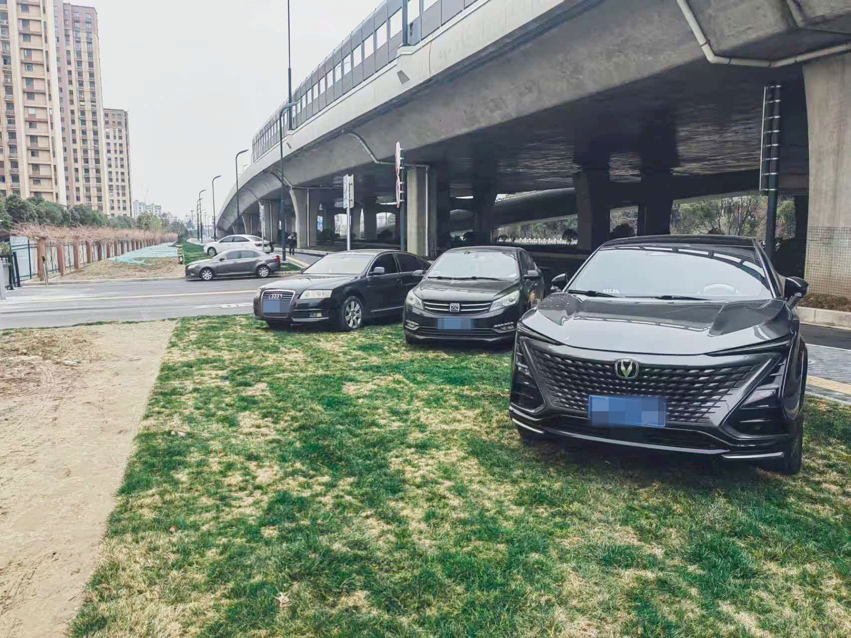 小区外草坪被停多辆车