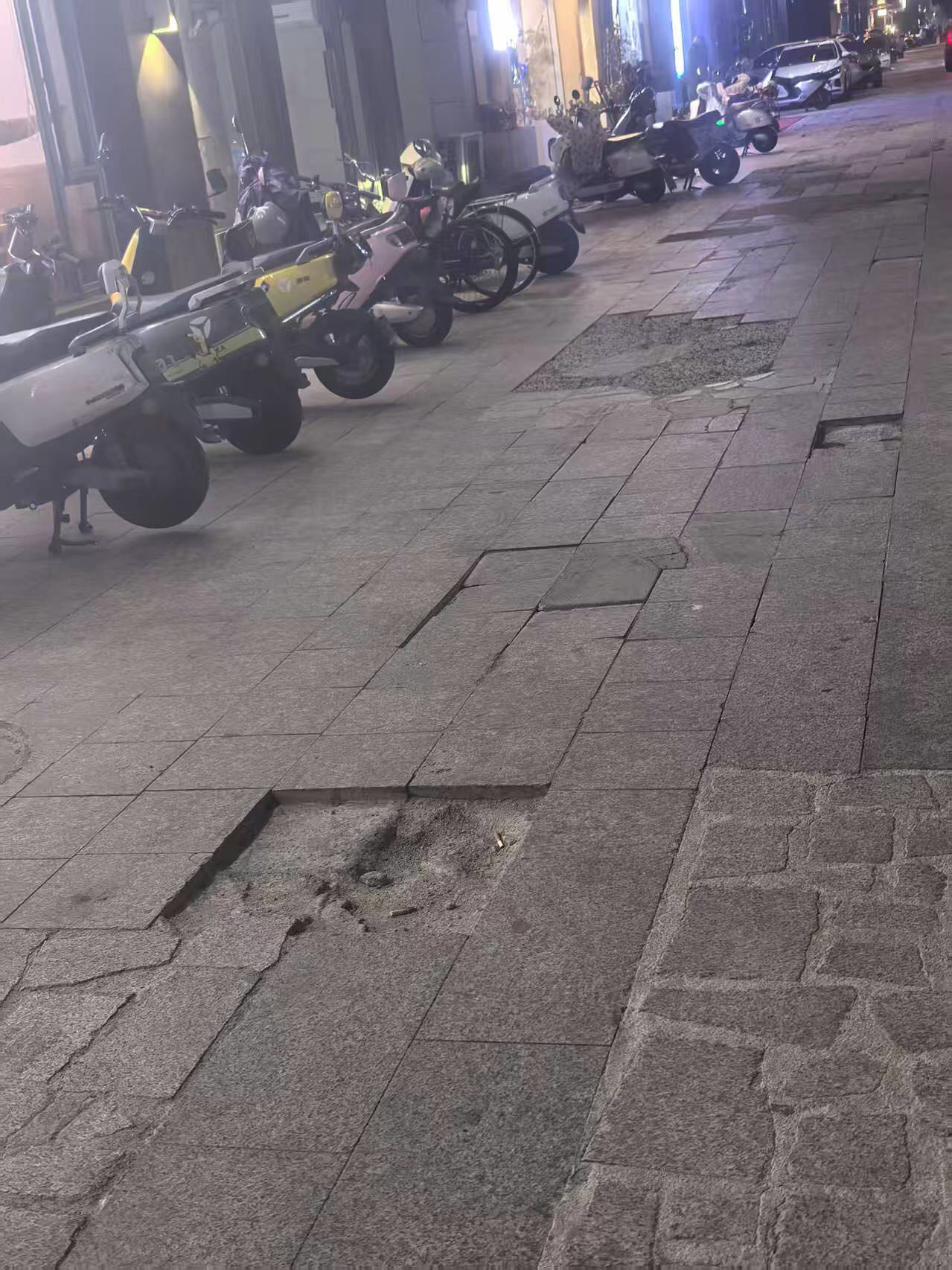 记者从美琪小区北门向东探访,看到各家商户门前原先铺设大理石的路面,如今密布大大小小的坑塘。原先的大理石损坏后,有的被填上了混凝土,有的混凝土又出现了剥落;还有的路面大理石损坏后也没有维修,路面出现较大的坑塘。商户告诉记者,路面通行车辆较多,大理石路面设计难以承压,所以容易损坏。路面损坏既影响环境,也给商户和客人通行带来不便,希望相关单位加以维修。