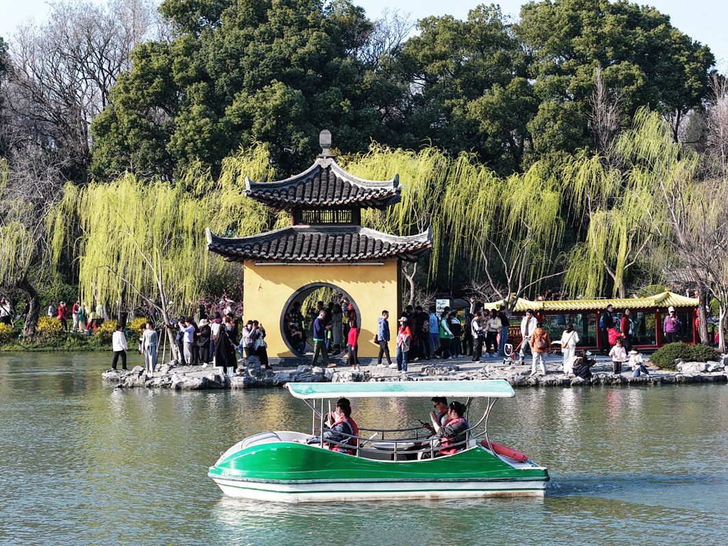 走进景区内,更是人头攒动。瘦西湖二十四桥、长堤春柳、五亭桥等处人流如织,五亭桥下游船穿梭,处处可见“船行碧波上,人在画中游”的春日盛景。何园因一棵玉兰成为初春“顶流”,不少外地游客慕名前来打卡,水心亭旁玉兰树下排起拍照长队;个园内竹影婆娑、叠石旁人流如织,南北游客在四季假山间流连忘返;茱萸湾动物园则被亲子家庭“承包”,草坪上帐篷点点,孩子们与动物亲密互动。宋夹城体育休闲公园、运河三湾公园等开放式景区也吸引了不少市民游客赏花打卡,享受美好假期。