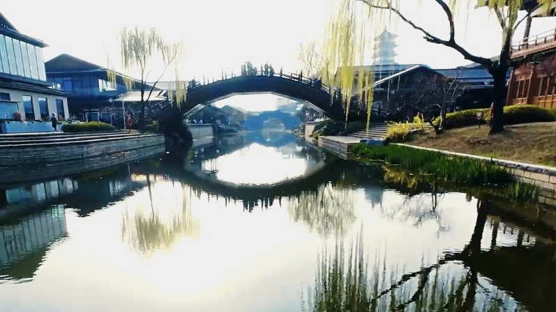 镜头从三湾运河街区河面低空起飞,紧贴碧波前行。两岸建筑错落有致,非遗工坊、文创商铺、滨水步道相映成趣,勾勒出“运河水街人家”的诗意图景。这里曾是扬州城南水陆门户,明代“三湾抵一坝”的水工智慧,让湍急河道化险为夷,成就漕运枢纽的千年传奇。如今,湿地绿意盎然,剪影桥、凌波桥横跨水面,传统肌理与现代景观交融,昔日“工业锈带”蝶变为“生态秀场”,成为市民游客亲近运河、感受非遗的城市会客厅。