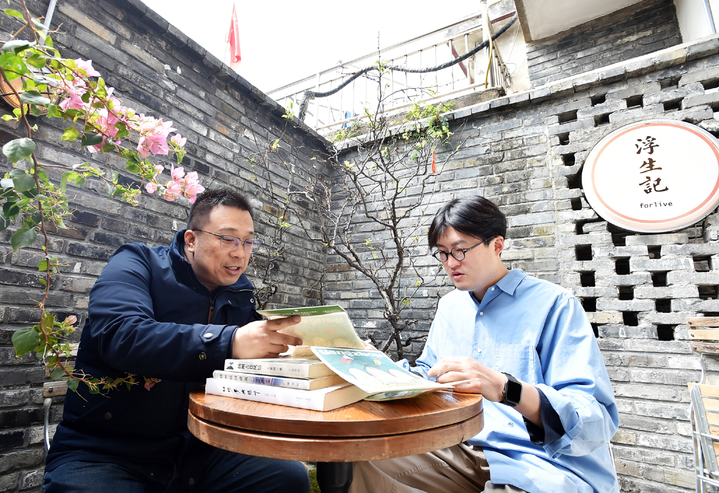 记者(左)和浮生记店主聊文创设计。