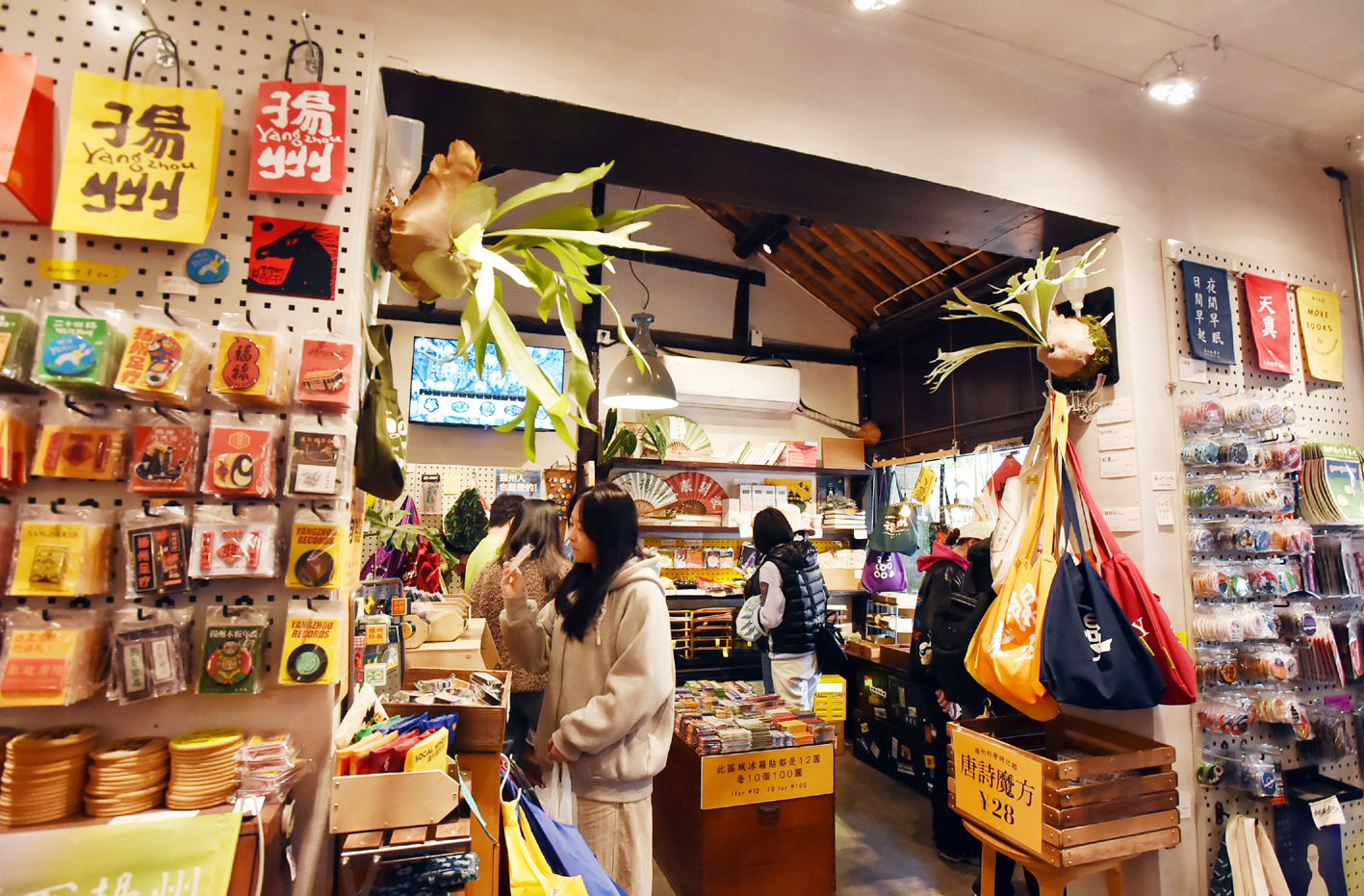 推开皮市街85号的木门,书香与咖啡香一同涌来。记者的目光被一整面墙和一排柜子牢牢锁住——那里摆满了各式各样的文创产品,从冰箱贴到帆布包,从洗碗布到搓脚石,每一件都透着浓浓的扬州味。