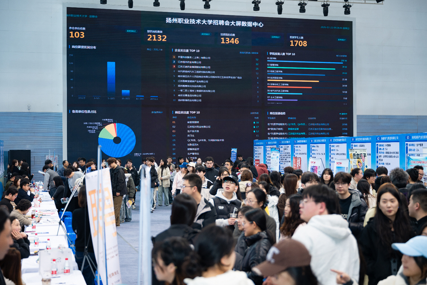3月22日下午,扬州职业技术大学体育馆内人头攒动,2026扬州工会“职等你来·春风行动”职大专场招聘会火热举行。103家优质企业携2100多个岗位走进校园,其中近八成来自扬州本地。主要涉及高端装备、新能源、新材料、生命健康等新兴产业领域,为毕业生送上了一场“就业及时雨”。现场AI简历“问诊”、大屏实时“霸榜”,从“面对面”到“屏对屏”,这场招聘会真的很“潮”。
