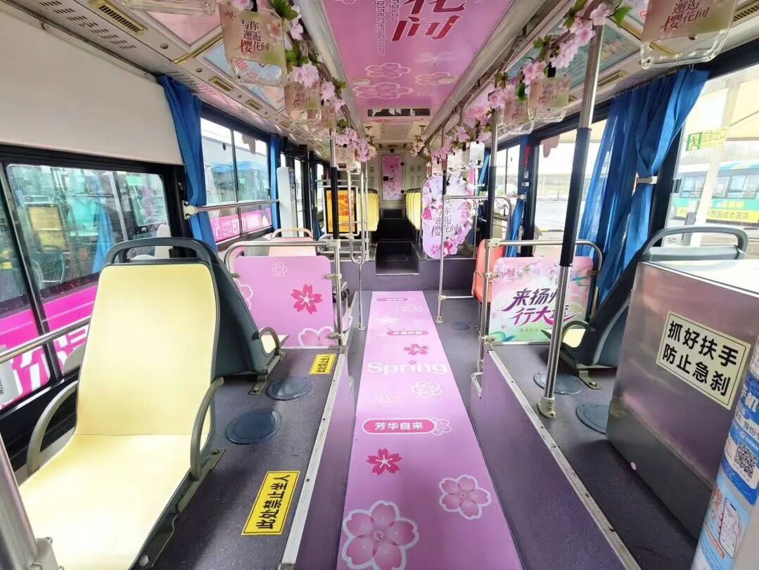 据市公交集团相关负责人介绍,以上三条赏樱专线公交车辆,均以粉白樱花为底色,搭配“与你邂逅樱花间”的暖心标语。另据介绍,双层观光赏樱专线也将于3月25日上线。