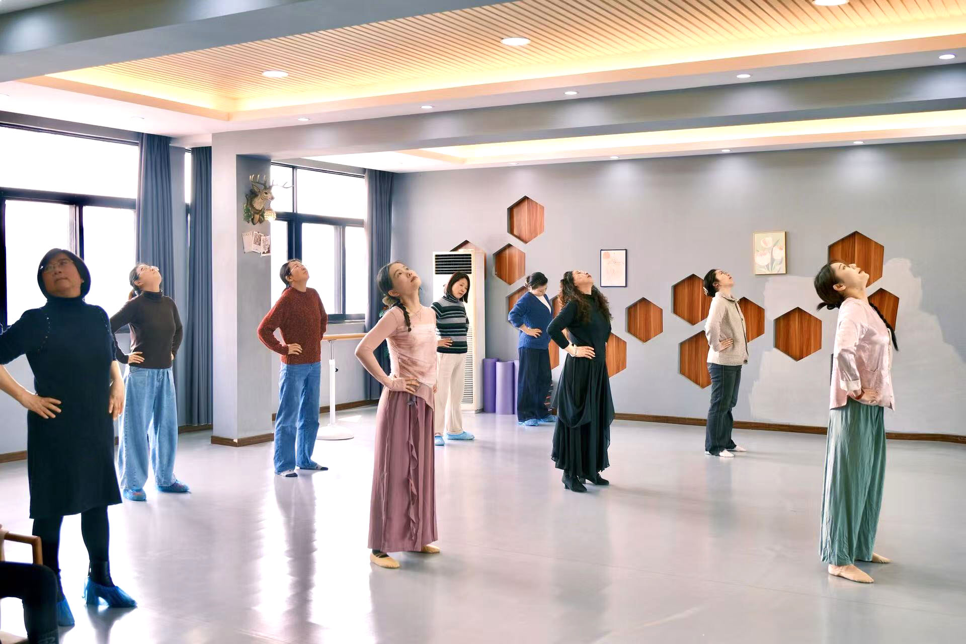 3月21日,邗江区新城河路洵觅舞蹈工作室,一群来自邗上街道兰庄社区的阿姨们在舞蹈老师谢萌萌的指导下,开始学跳中国舞。