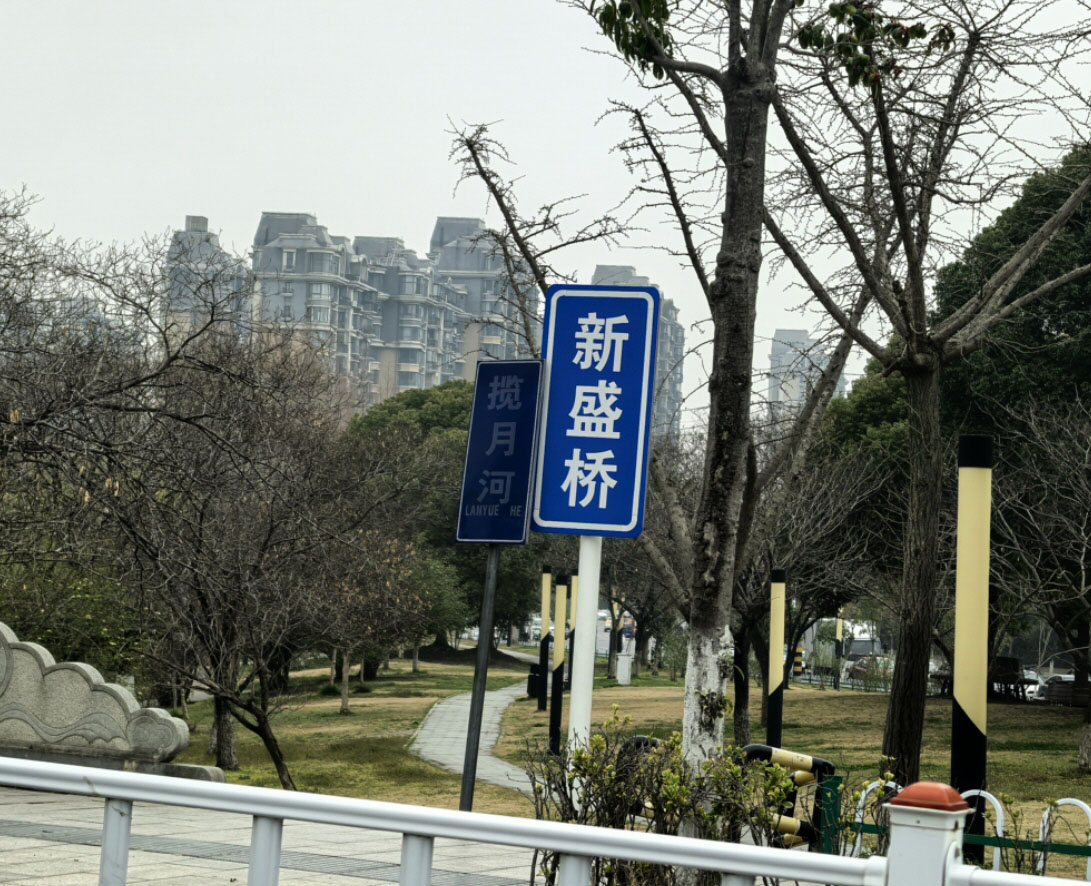 孔先生表示,新盛桥东西两侧的揽月河河道边,竖着河道名牌,牌子上有中文,也有拼音,但是有两块牌子上,白字早已经模糊不清,好多年了,与旁边新盛桥名牌上醒目的白字形成鲜明对比,希望相关部门能更新。