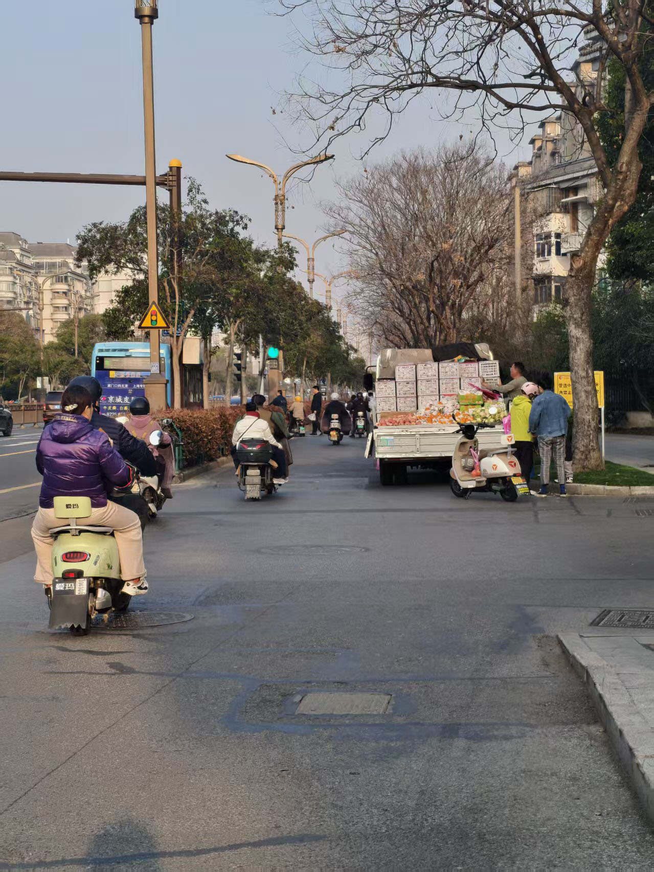 记者来到文昌中路与曲江北路交叉口,看到确实有少数摊贩在附近做生意,以卖水果为主。记者看到,装载着水果的大货车停在非机动车道边,占用一小半通行空间,来往市民骑车经过都会下意识放慢车速,注意通行安全。记者还留意到,有市民经过时被摊贩的吆喝声吸引住,停车挑选水果等商品,生意好的时候,货车周边停着多辆电动车,阻碍其他市民通行。