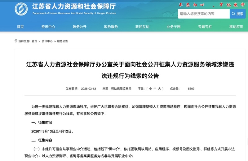 交汇点讯 即日起至4月12日,如果你在求职过程中遭遇过“黑中介”、被收取不合理费用、被扣押证件,甚至被虚假高薪诱骗,都可以向主管部门直接反映。江苏人社厅办公室发布公告,面向社会公开征集人力资源服务领域涉嫌违法违规乱象,全力维护求职者合法权益。