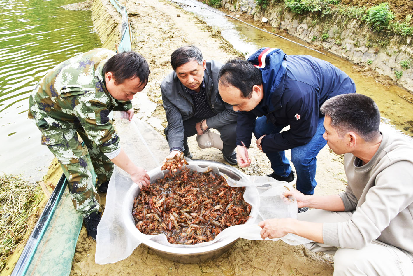 3月17日—23日,张家宏一行深入水头村81亩“一稻三虾”核心示范基地,现场指导当地干部群众如何标准化投放小龙虾苗种,提高小龙虾成活率,并现场演示如何为小龙虾苗种开展盐浴消毒、VC抗应激等操作方法,同时指出了在虾苗起捕、装载和运输过程中存在的不足之处。