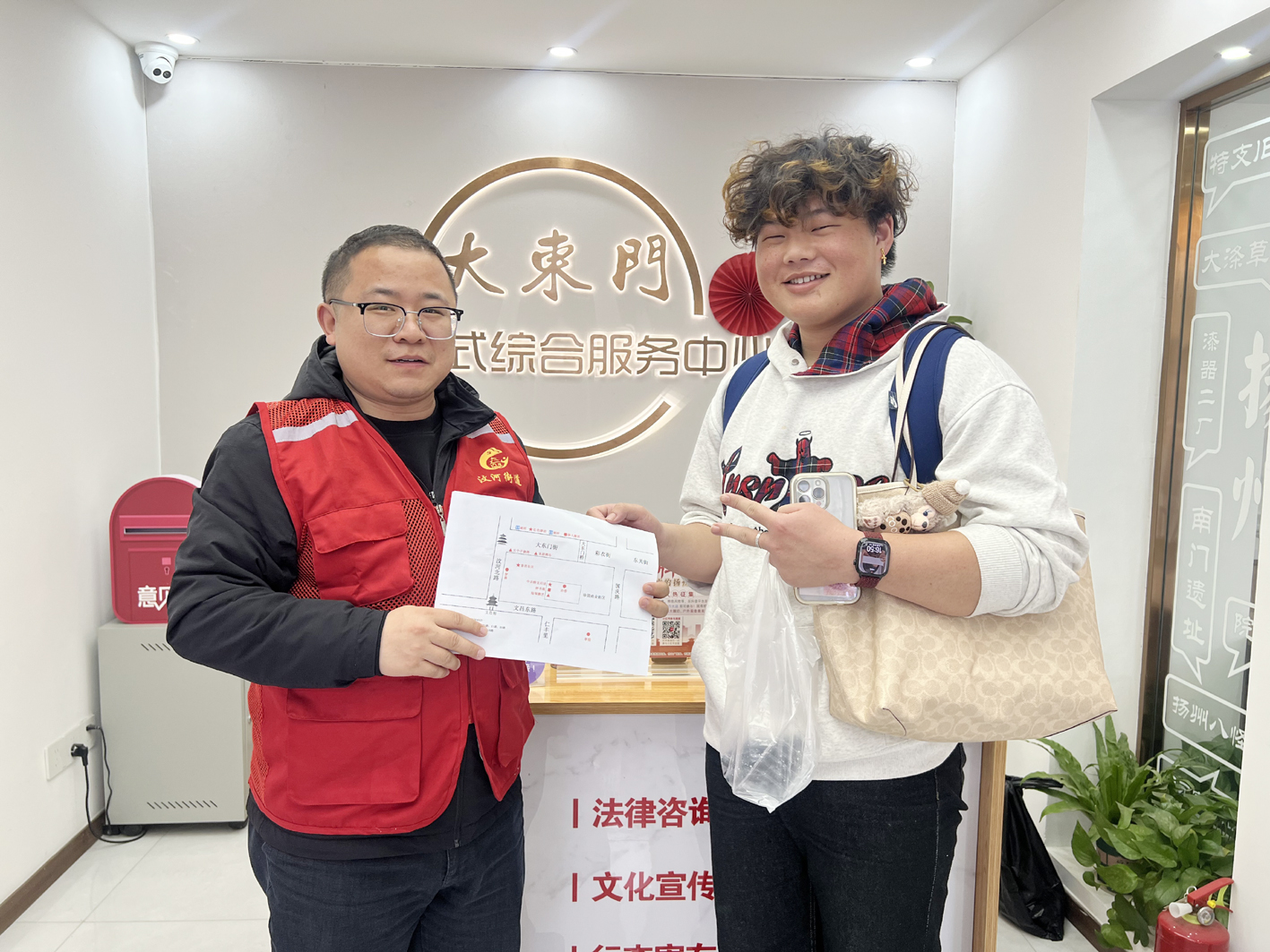 原来,徐阿姨逛完瘦西湖、个园之后,准备到广陵古城游玩,可并未提前制作攻略,对景点位置、通行线路等信息一概不知,于是向服务中心求助。由于徐阿姨使用的是老年手机,无法上网检索,一名志愿者便想出了一个“笨方法”——手绘地图。