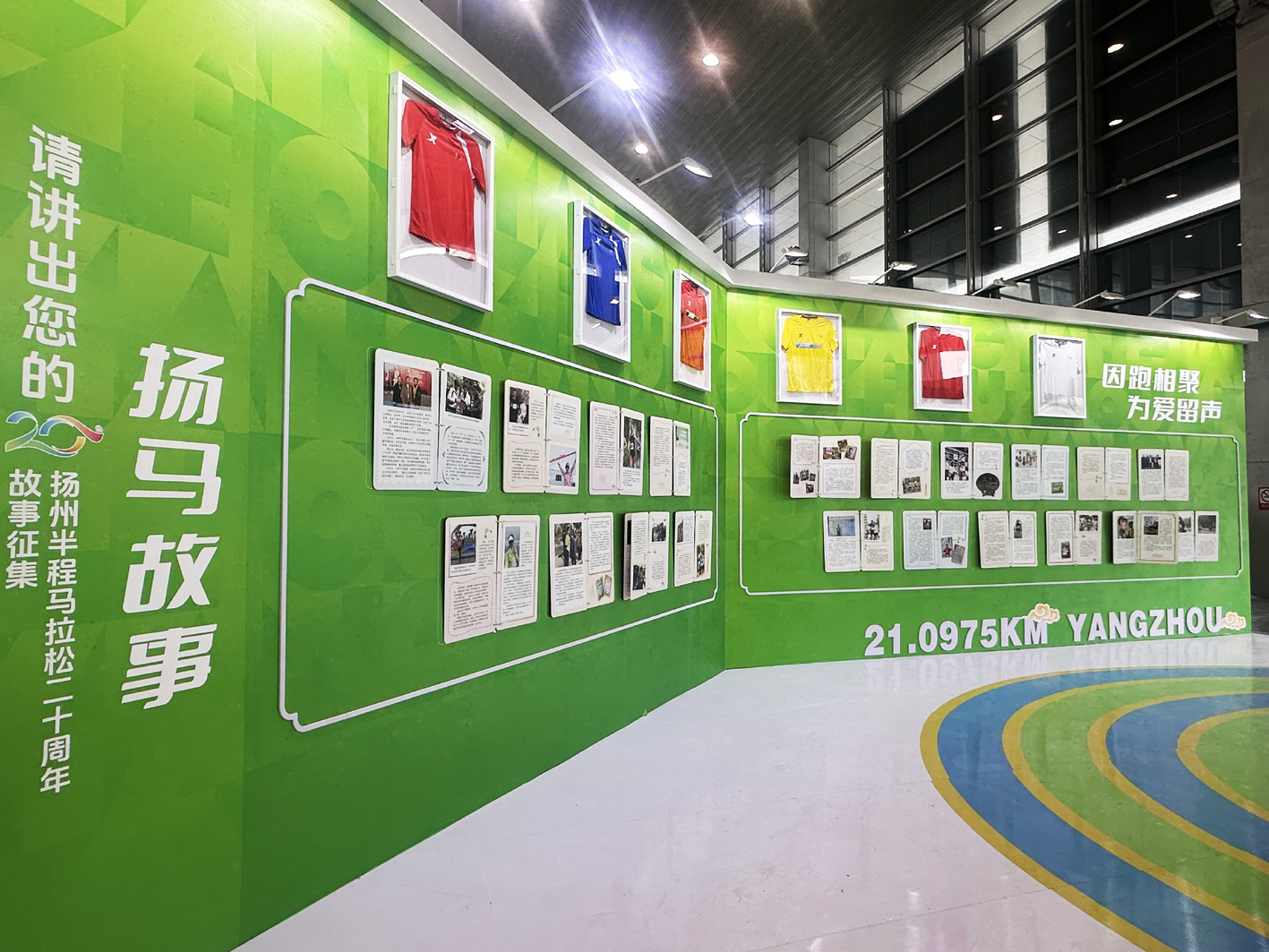 一旁的记忆长廊里,藏满了扬马跑友的共同回忆。主办方从扬马二十周年人物故事征集活动中,精选出20篇具有代表性的人物故事集中展现,吸引了不少跑友驻足细读。