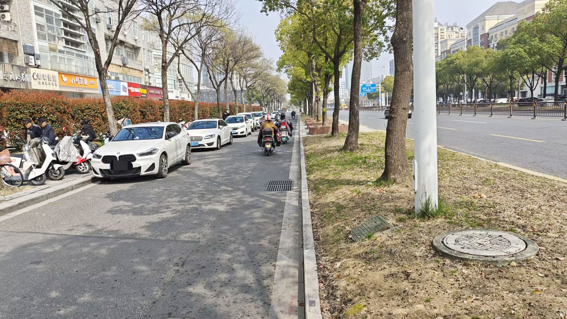 路边有车辆乱停,有骑车市民逆行