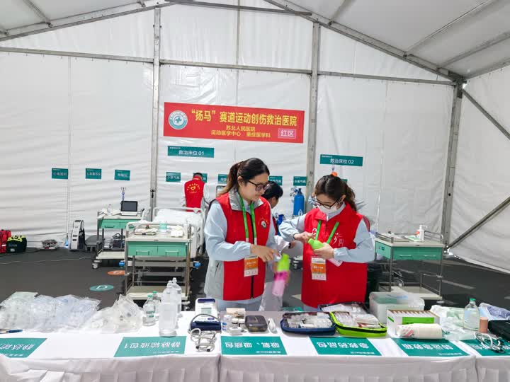 与往年不同的是,今年“扬马”终点医疗保障点首次升级为移动医院,分设红、黄两个功能区。红区由重症医学科ECMO快速反应小组负责,配备便携式AED和ECMO设备;黄区则由运动医学科、急诊科及护理部人员组成,专门处理擦伤、肌肉痉挛等轻中度伤情。据统计,截至中午12点,该“赛道医院”当日累计服务跑者150人次,所有伤情均得到及时有效处置。