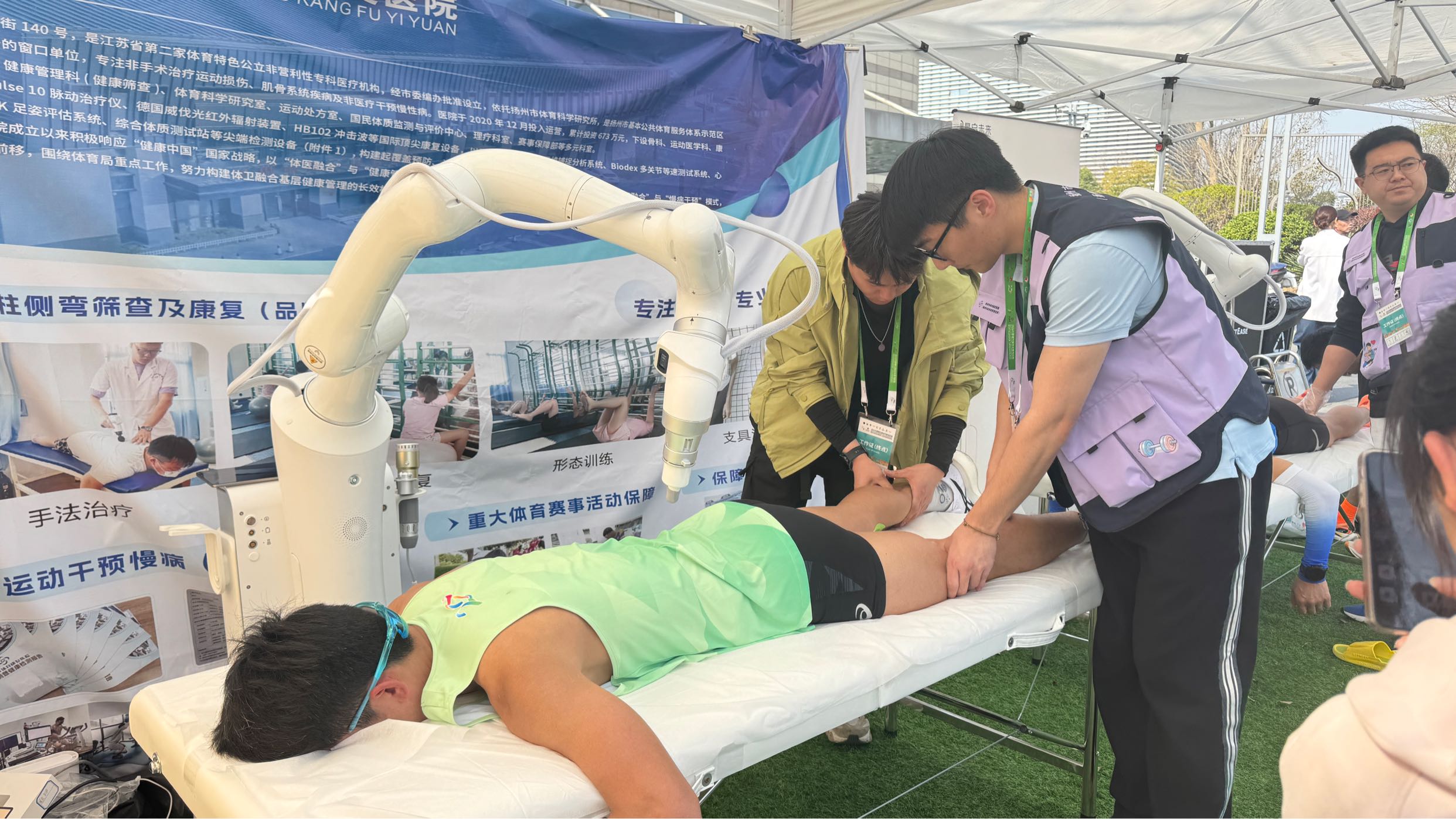 除了医疗救治,赛后恢复区同样亮点纷呈。在终点拉伸区,来自扬州大学体育学院300人的拉伸组为跑者提供专业赛后康复与拉伸服务;冰敷区内,跑者们有序进行冰敷,缓解肌肉肿胀和关节酸痛。更引人关注的是,扬州市体育康复医院首次引入运动康复机器人,将“穴位定位”与“智能拉伸”技术相结合,为运动员赛后恢复提供标准化、高效化服务,大幅提升了赛后恢复效率。