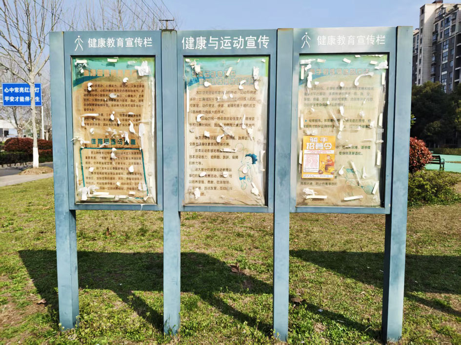 近日,市民谢先生向扬州发布手机App报料平台反映,广陵经济开发区体育公园内宣传栏区域玻璃陈旧,有掉落的风险,居民在附近活动不安全。此外,玻璃内张贴的关于“健康与运动”内容的宣传纸张也显得残旧。针对以上问题,谢先生希望辖区主管部门对玻璃加以固定或更换,定期更新相关宣传内容。