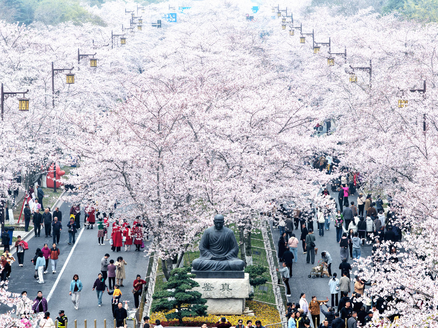 春风拂面,繁花盛开。人们踏春赏景,漫步在花海之中,感受春日生机与美好。3月31日,游客在扬州市鉴真路上的“樱花大道”赏樱游玩(无人机照片)。 孟德龙 摄