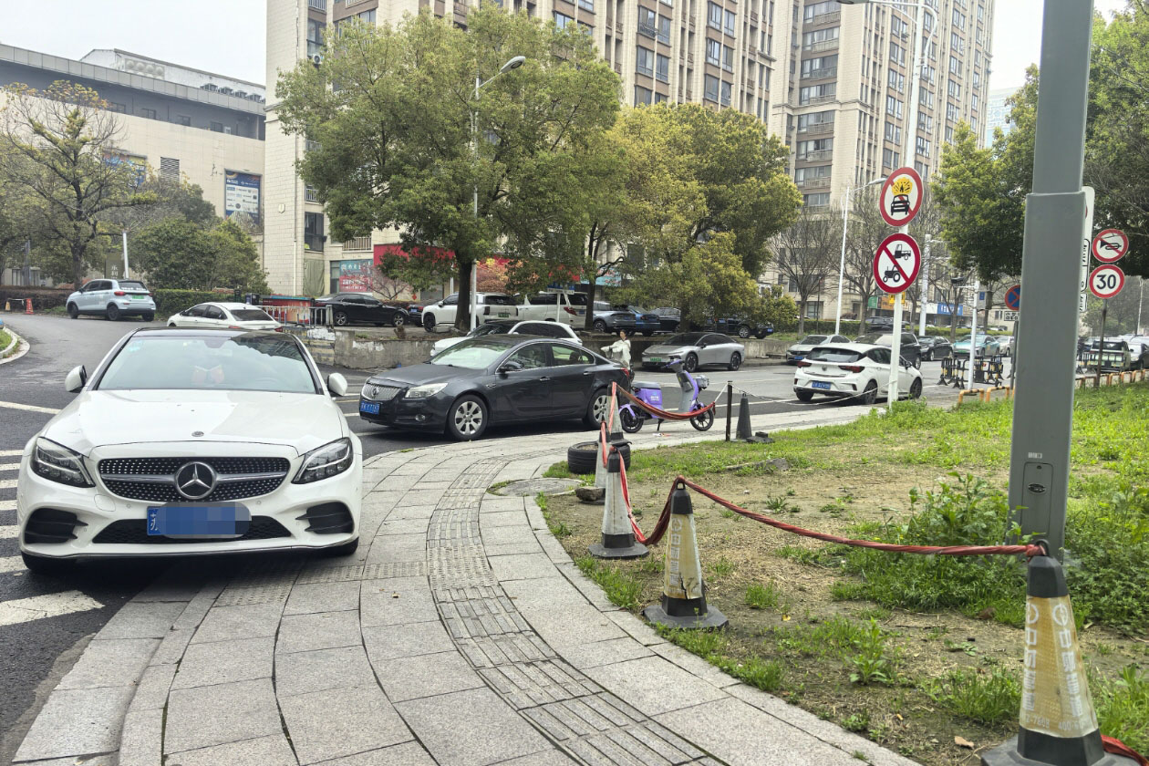 3月31日,记者再次来到该路口探访,在月城路西南侧路口的绿地外围已经做了围挡,绿地内没有车辆停放,但是绿地外围的路口车道以及部分人行道上,有私家车停放,尤其是拐弯口,车辆停放后影响非机动车靠边通行。记者现场根据车牌号拨打了114,联系车主尽快挪车。