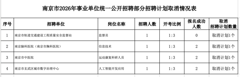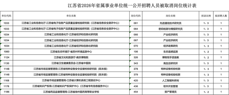 交汇点讯2026年江苏省属及13个设区市事业单位统一公开招聘报名工作已全部结束。记者查看各地招聘公告发现,此次提供的6105个招聘岗位中,至少有22个招聘岗位因未达到开考比例被取消。