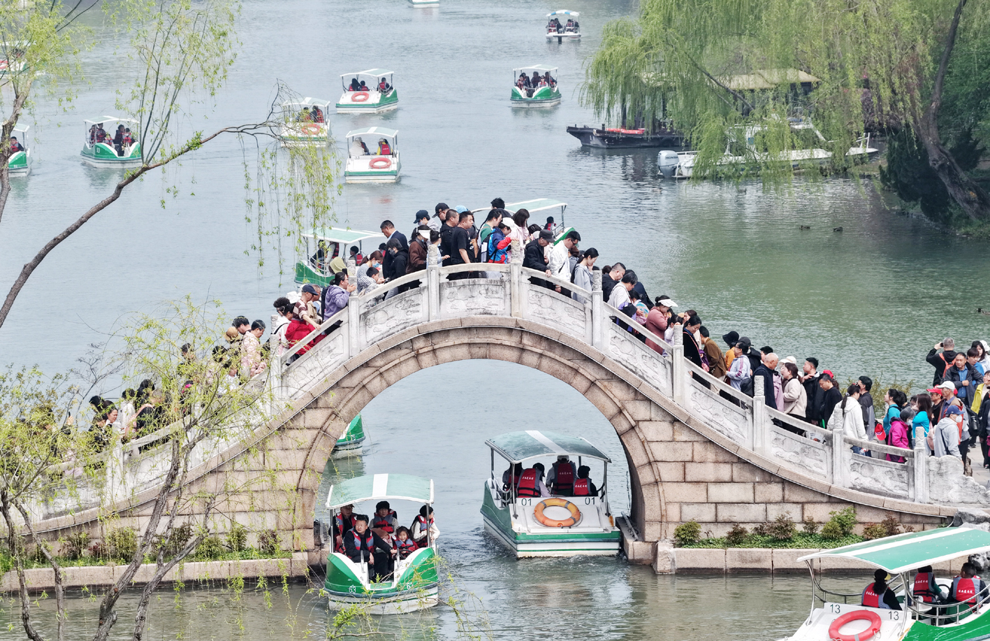 “孩子刚考完试,正好赶上春假,带他来放松一下。瘦西湖比课本上写的还美,孩子一路都在兴奋地背诗。”来自南京的游客张女士笑着说。