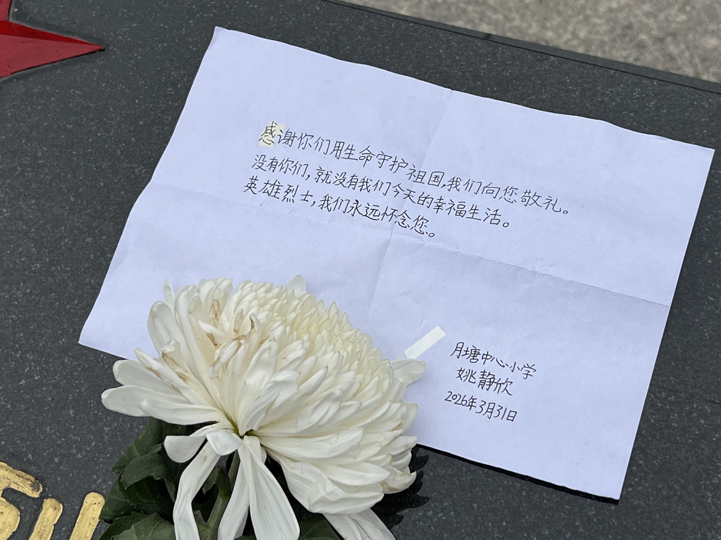 扬州网讯 (通讯员 周晓明 李成星 记者 程宝军) 清明寄哀思,英烈永长存。清明将至,3月31日,仪征烈士陵园内静谧庄严,一场跨越时空的“特殊对话”在此展开。一座座烈士墓碑前,整齐摆放着一束束洁白的菊花,不少花束下都压着一张写给烈士的小纸条,这是当地少年的“悄悄话”,他们以这样庄重而特别的方式,寄托对英烈的哀思,告慰革命忠魂。