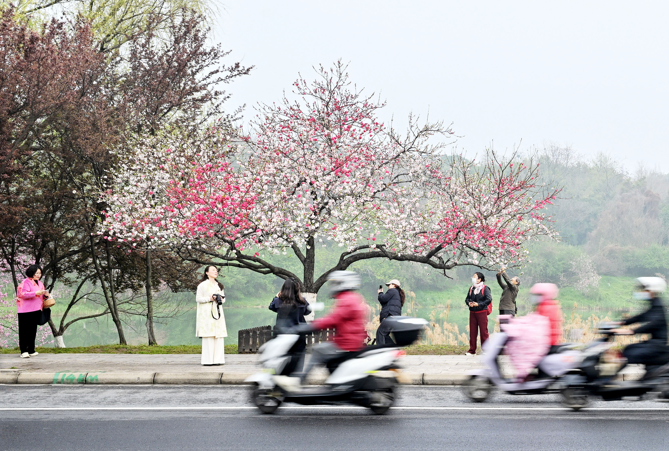 近日,汉陵苑前的“网红”洒金碧桃如期绽放,一树之上开出白、浅粉、深粉、深红四种花色,再度吸引大批市民、游客慕名前来打卡拍照。