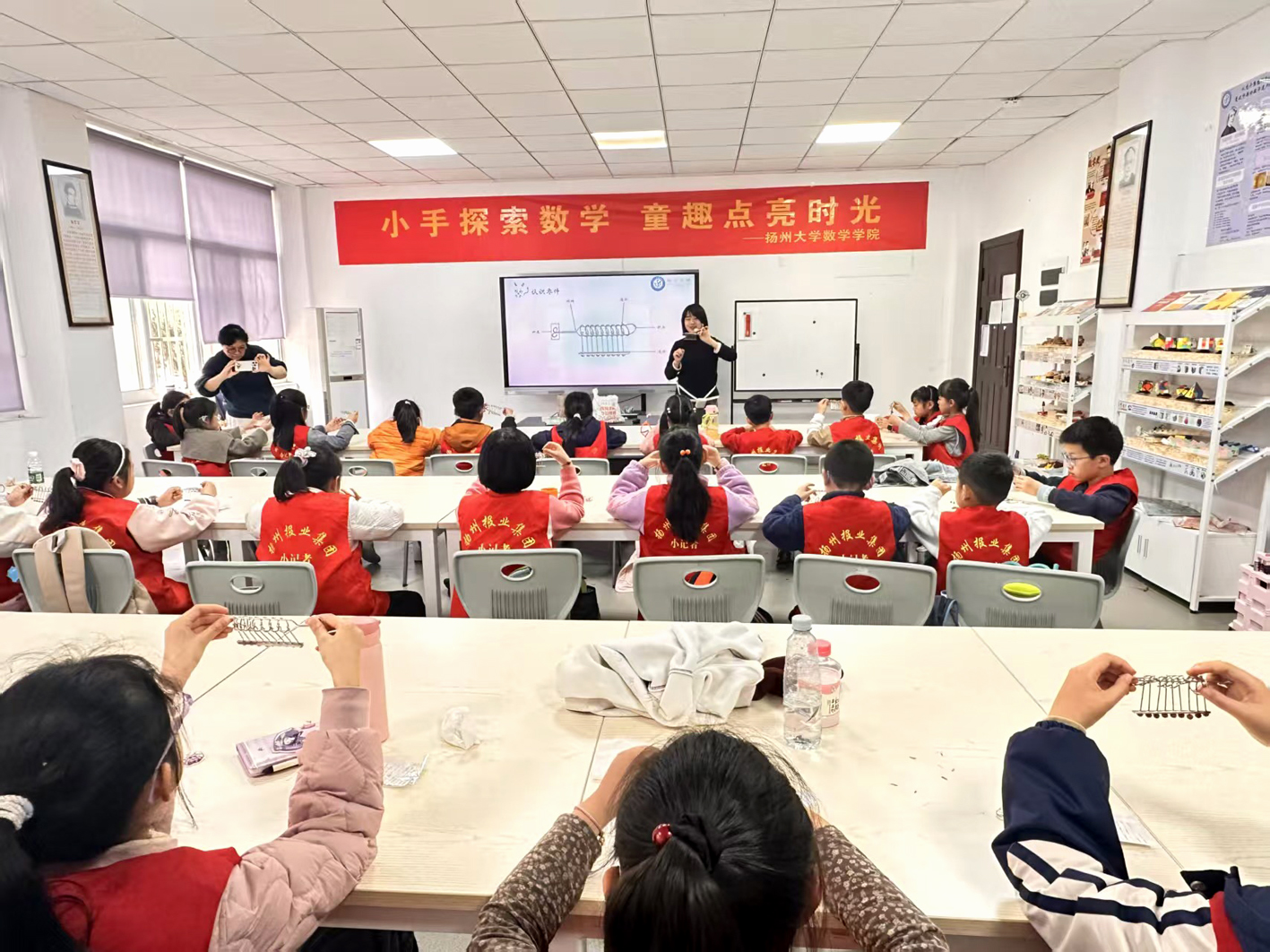 扬州网讯(通讯员 刘宁宁 卢奕 记者 乔云) 4月2日,春意正浓,扬州大学瘦西湖校区数学学院迎来了一批特殊的“小客人”——来自扬州市新闻传媒中心的近30名小记者。这一天,他们不是来听课,而是来“玩”的。从古老的鲁班锁到神奇的九连环,从清香的竹编到叮咚作响的植物风铃,一场名为“清明润童心 科普益创行”的趣味科普活动,让孩子们在动手动脑中惊喜地发现:原来数学可以这样“好玩”。