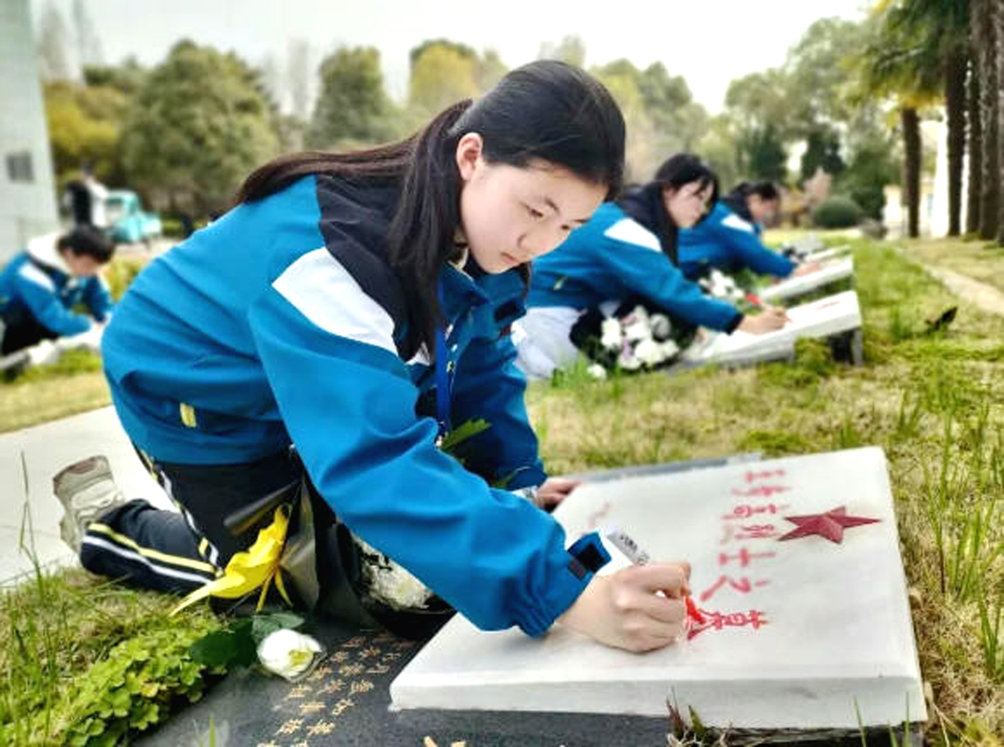 同学们蹲在墓碑前,手握朱红油漆笔,一笔一画,小心翼翼地描摹着碑文上每一个名字。这不仅仅是在修复文字,更是在擦拭历史的尘埃,是在与先烈进行一场跨越时空的对话。当年轻的手指触碰冰凉的碑石,不同时代的温度在此交汇,无声地传递着“铭记”与“传承”的誓言。许多同学还敬献了自己制作的小白花,表达无限的崇敬与追思。