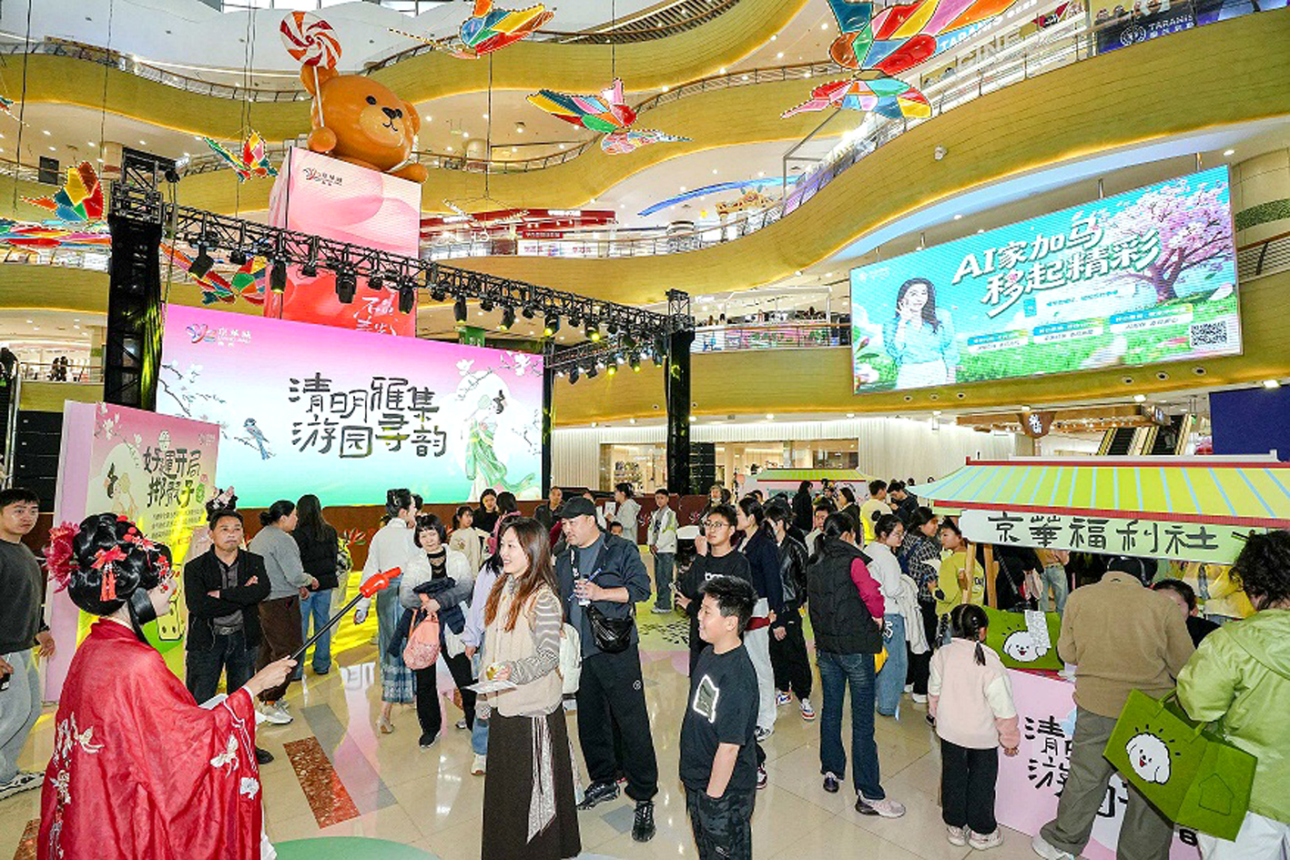 商圈消费掀起春日优惠热潮,全市重点商圈商超密集推出折扣、满减、团购券、积分兑换、消费赠礼等优惠。仪征宝能环球汇推出60元团100元零售券、1元团50元餐饮券及消费满额赠电影券、尊尚卡活动;邗江万象汇美陈焕新桃花主题的同时,在清明小长假期间推出桃花寻味市集;京华城推出春假专属互动活动,还有50元团100元、258元团300元等超值团购,部分服饰品牌低至四折,黄金、数码、餐饮消费满额赠礼,同步上线学生专享福利,进一步释放消费潜力。