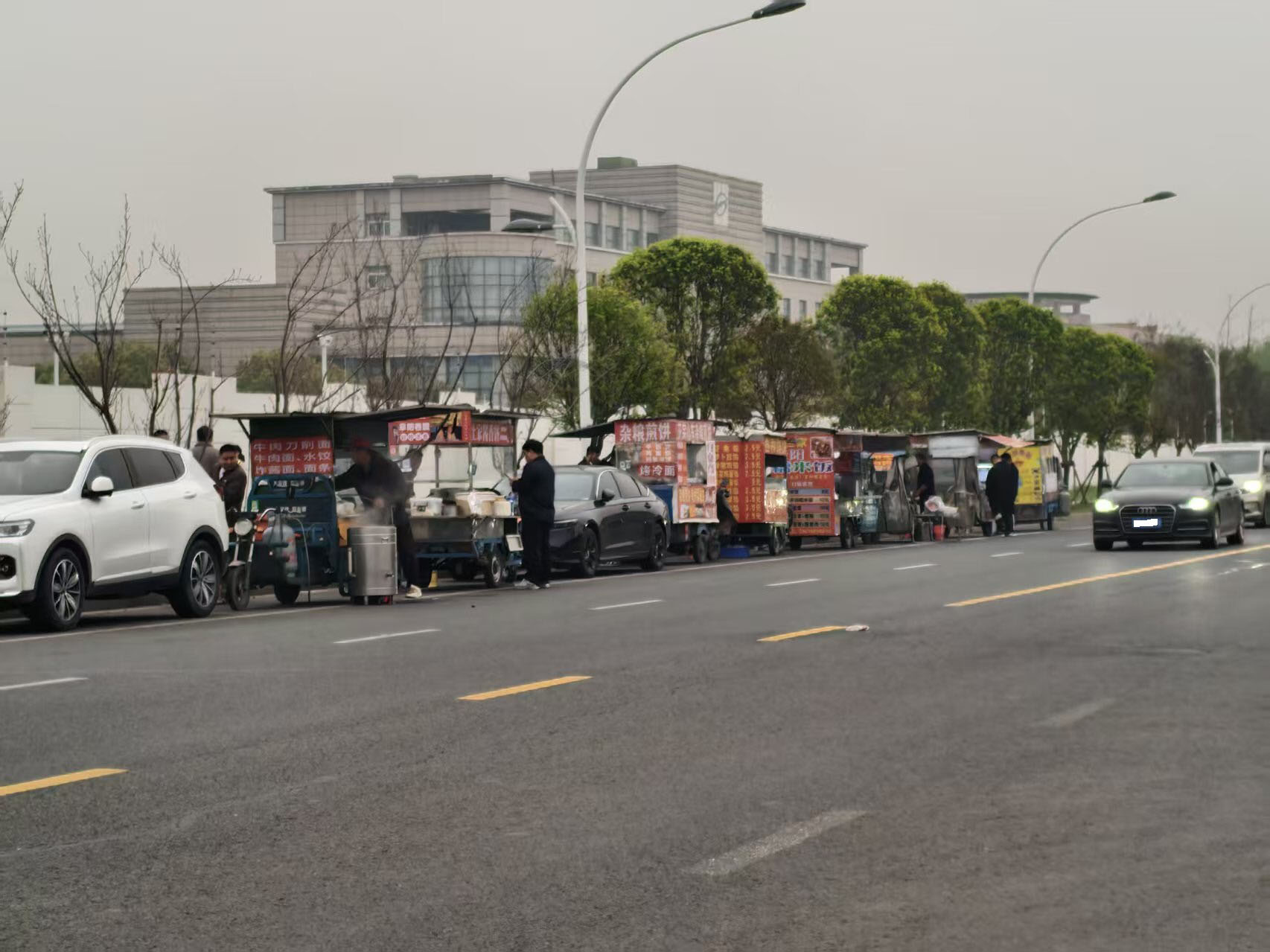 市民申女士介绍,金港路位置较偏僻,周边厂房、单位多,频繁有诸如货车、厢式货车、渣土车等大型车辆经过,一些大车还临时停靠在路边。摊贩将摊点设在路边车辆停靠位置附近,有较大的安全隐患,“我看有的小吃摊点生意很好,时不时聚集了一批批顾客,这时如果停在路边的大车突然启动,有视线盲区的话,就容易发生碰撞。”