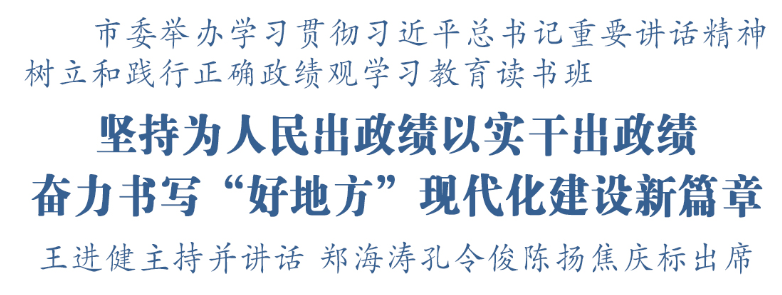 王进健强调,要原原本本研读《习近平关于树立和践行正确政绩观论述摘编》,从整体上深刻理解把握树立和践行正确政绩观的重大意义、根本立场、价值取向、重要内容、实践路径、重要抓手和根本保障,解决好“政绩为谁而树、树什么样的政绩、靠什么树政绩”的根本性问题,树牢正确的利益观、权力观、地位观、发展观、实践观。要深刻理解把握习近平总书记关于开展学习教育的总要求,以习近平总书记在地方工作期间坚持正确政绩观实践为生动教材,坚持立党为公的执政理念,践行为民造福的价值追求,提升科学决策的能力水平,锤炼真抓实干的过硬作风,真真正正为人民出政绩、以实干出政绩。