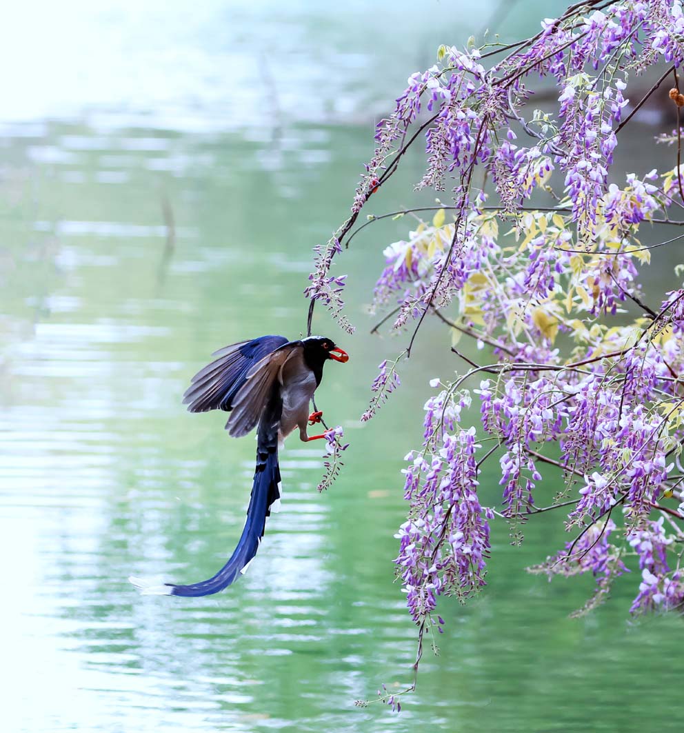 清明时节的扬州,烟雨润柳,草木萌发。在仪征龙山、蜀冈东峰一带的山林间,常能邂逅一种羽色华丽的飞鸟 —— 红嘴蓝鹊。它是鸦科蓝鹊属的大型留鸟,体长可达54至65厘米,其中修长尾羽占体长近一半,飞行时如拖曳蓝绸,姿态飘逸。