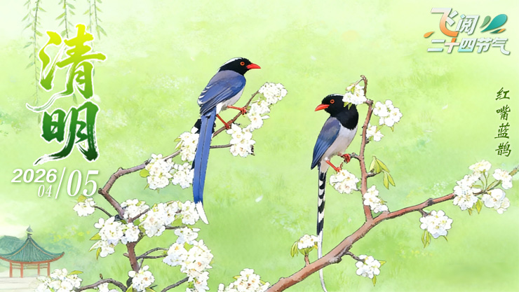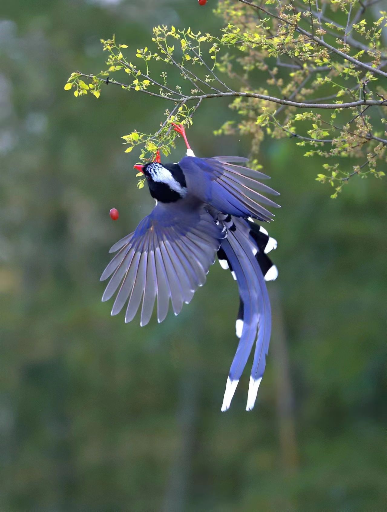 红嘴蓝鹊外观极具辨识度:头部至前胸呈丝绒黑色,枕部缀一块醒目的白斑;背、翅与尾羽泛着紫蓝光泽,嘴与双脚呈朱红色,腹部纯白。作为杂食性鸟类,它以昆虫、野果、种子为食,清明前后正值昆虫复苏、花果初绽,为其提供了丰足食物。它们喜结 3 至 5 只小群活动,鸣声尖锐清亮,常在枝头跳跃、林间滑翔,警觉又活泼。