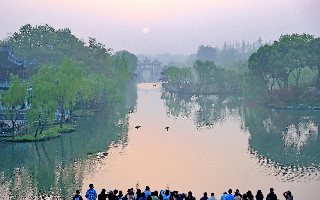 每年清明节前后,站在瘦西湖熙春台观日出,是一件十分愉悦的事情。上午6点左右,旭日冉冉从五亭桥上方升起,黑天鹅湖中游弋,野鸭低空飞翔,构成一幅和谐优美的自然画卷,吸引了众多摄影爱好者前来拍摄。