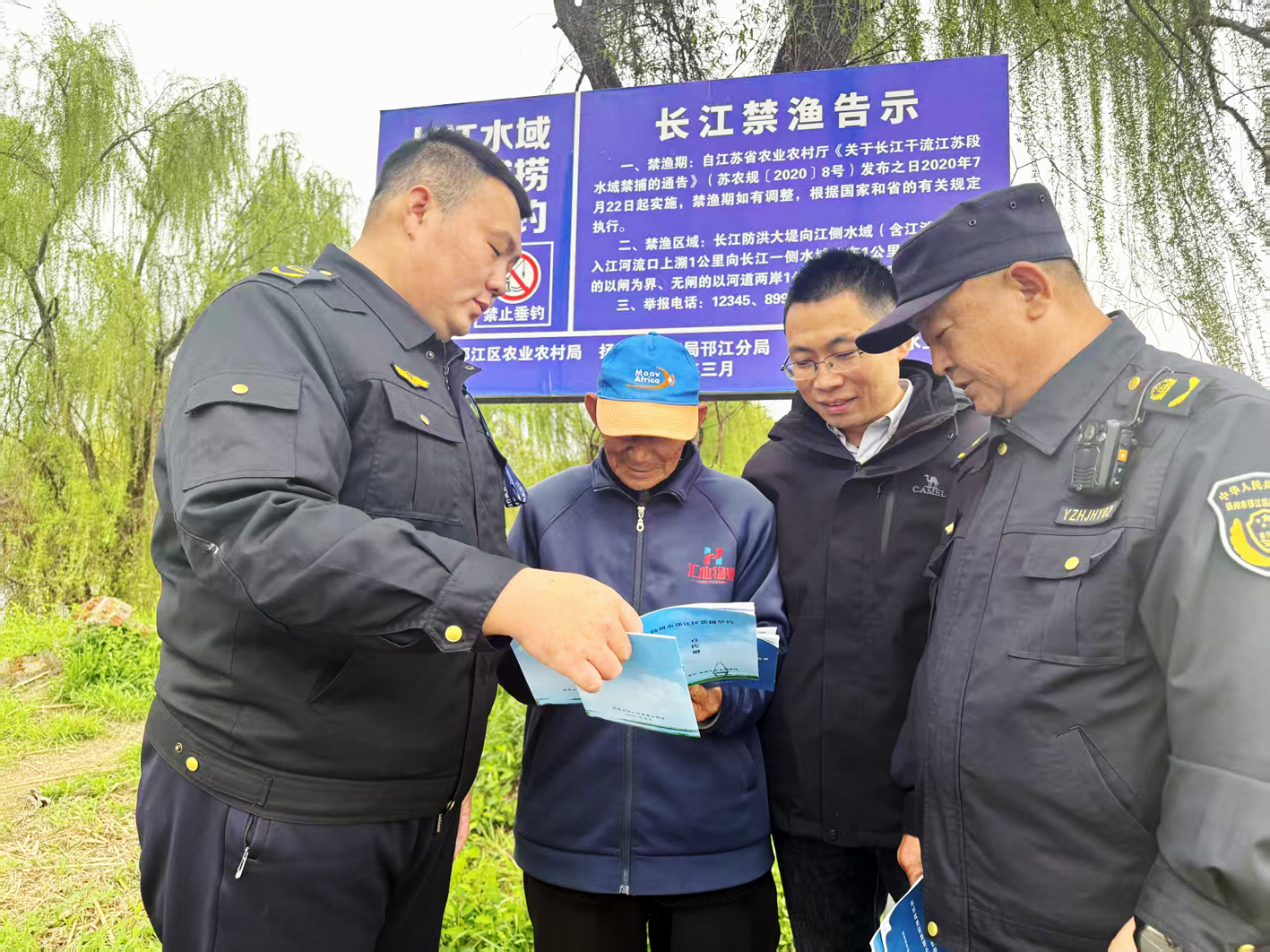 记者(右二)和护渔员一起宣传长江“十年禁渔”政策。
