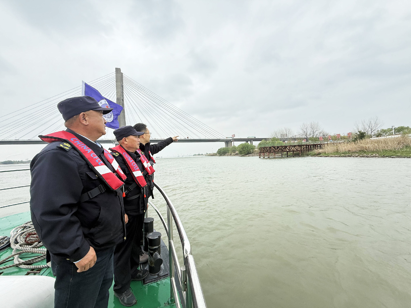 路面巡查结束,记者跟随王明凤换上救生衣,登上渔政船开启水上巡查。站在渔政船上,记者看到清澈的江面能隐约望见水下水草,一群水鸟低空掠过,发出清脆鸣叫。“以前江面可没这么清,捕鱼船多,渔网乱飘,水都是浑的,鸟也少见得很。”王明凤扶着船舷,语气里满是感慨。执法船驶过润扬大桥下,江风拂面,队员们举目远眺,仔细排查江面是否有非法作业船只与违规网具。