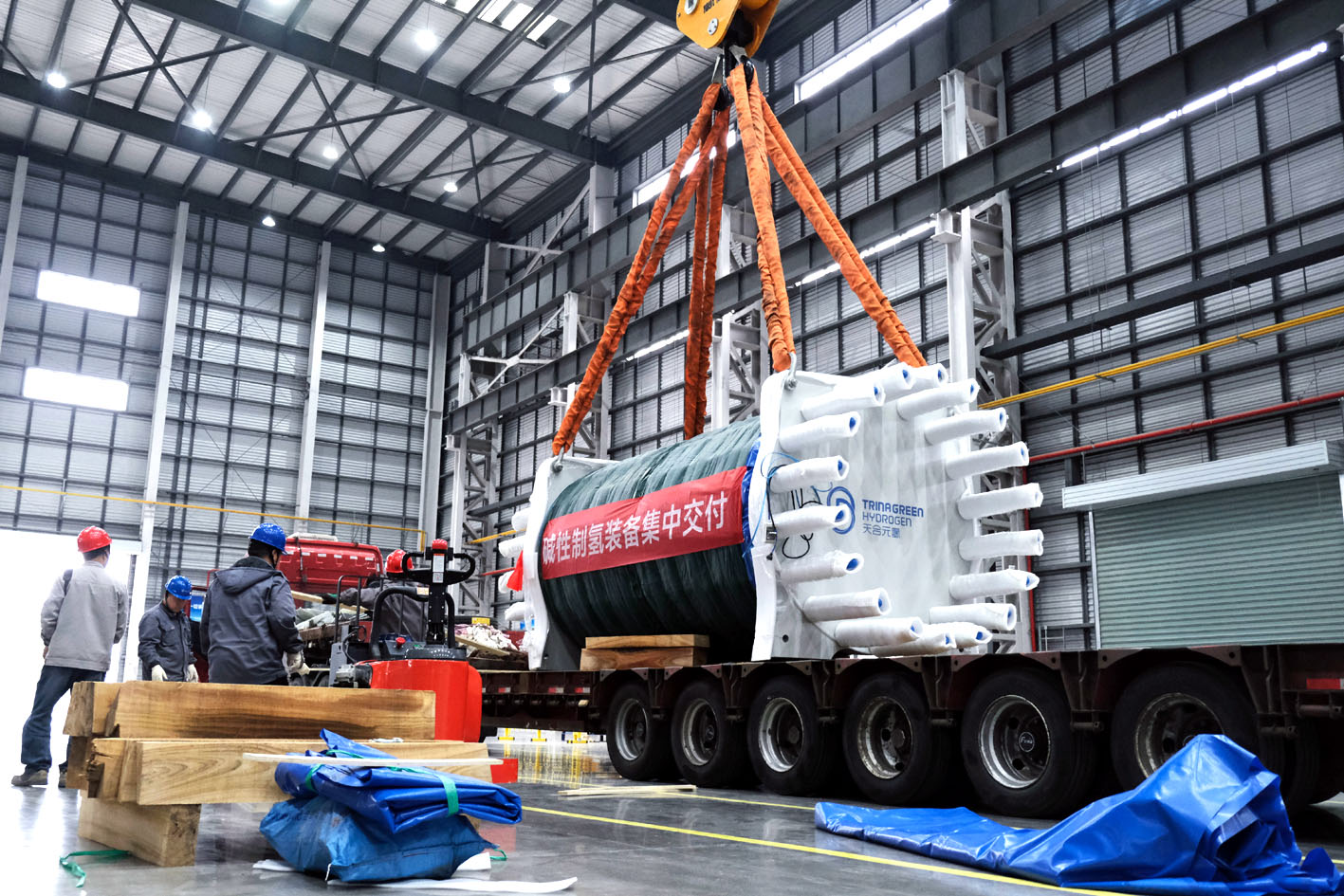 据悉,此次交付的第二代“天擎”系列旗舰产品,专为大规模风光可再生能源制氢场景量身定制。设备采用橇装式模块化设计,集成度高、部署灵活,凭借自主研发的高电密电极技术,实现3500A/㎡的商业化稳定运行,直流电耗行业领先,核心性能指标稳居行业前列。同时,设备具备30%—110%的宽负荷调节能力,可适配风电、光伏等间歇性绿电场景,保障制氢系统高效、稳定、经济运行。