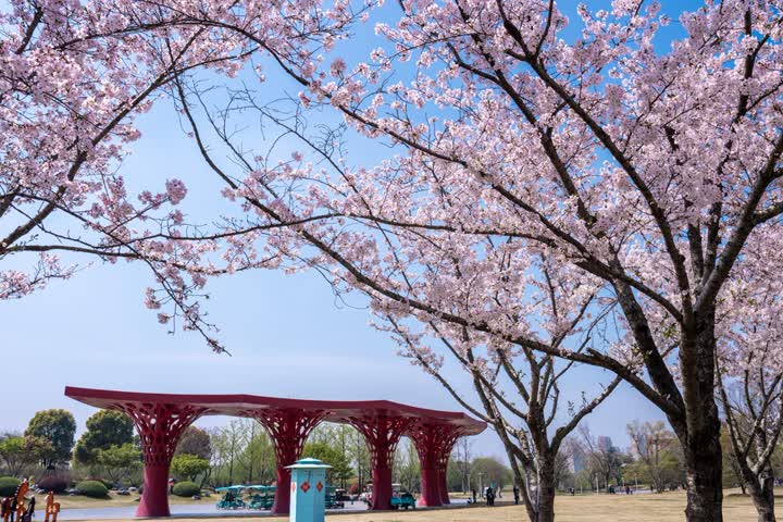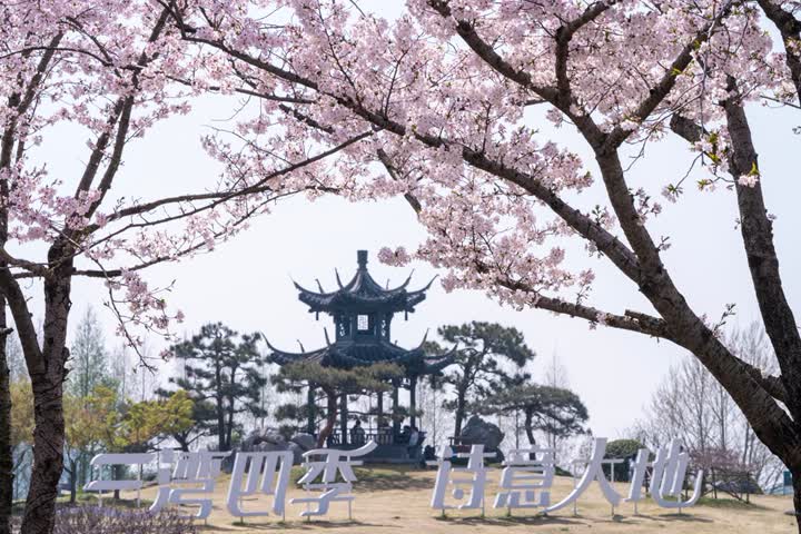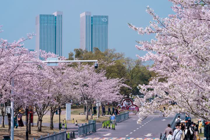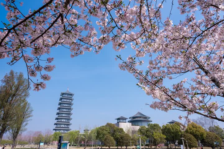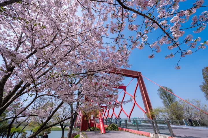 在扬州运河三湾风景区内种植有樱花、琼花等500多种植物,其中凌波桥西侧的晚樱林是扬州市较为集中的樱花观赏区之一。当下正值樱花最佳观赏期,单株樱花花期约14天,粉白相间的花瓣层层叠叠,如云似霞,微风拂过,落英簌簌飘落,铺就一地温柔花毯,形成浪漫的“樱吹雪”盛景,将运河岸线装扮得如梦似幻。