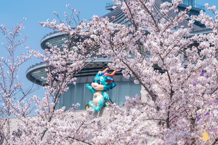 憨态可掬的萌兽“安澜”静卧樱花树下,圆滚滚的模样与粉白樱花相映,成为游客拍照打卡的热门点位。运河水静静流淌,花影随水波轻摇,剪纸风格的剪影桥、现代感十足的凌波桥横跨河面,大运塔巍峨耸立,樱花与这些景观交相辉映,勾勒出古今交融的独特韵味,既有江南水乡的温婉,又有春日繁花的绚烂。