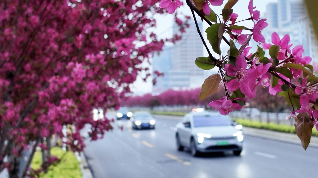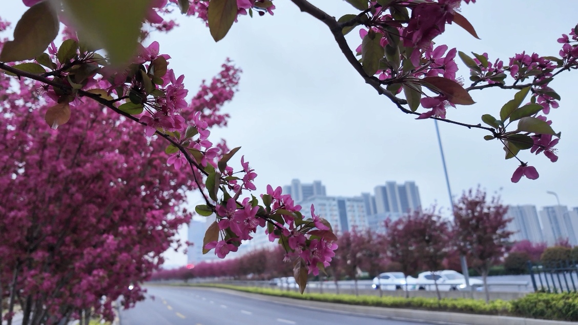 红花配绿叶,相映自成趣。鲜红的海棠花与翠绿的叶片相互映衬,色彩对比鲜明又格外和谐,一扫城市道路的单调。阳光洒落下来,透过枝叶与花瓣的缝隙,在地面投下斑驳的光影,微风拂过,光影晃动,花瓣轻轻飘落,宛如一场温柔的花雨,为城市道路披上了一层浪漫的外衣。无论是驾车穿行,还是步行漫步,都仿佛置身于花海之中,鼻尖萦绕着淡淡的花香,身心都被这满城春色治愈。