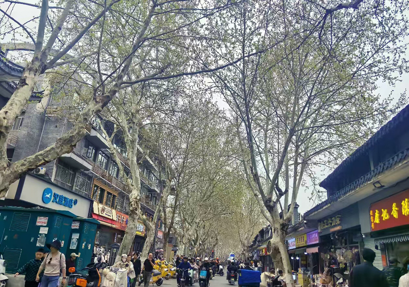 扬州栽种法桐的路段较多,比如淮海路、国庆路、渡江路、甘泉路、广陵路、大学南路、史可法路、淮海路、解放南路、徐凝门大街、联谊路、杨柳青路、茱萸湾路等。法桐生长快,树冠开阔,树形优美,夏季枝叶繁茂,像一把把巨伞,遮阴效果极佳。到了秋季,叶片呈橙黄、紫褐红等颜色,又是一番独特风景,而春季新叶发芽时,随着气温升高,成熟的果球开始炸裂,这段时间就是市民厌烦的飞絮时期。