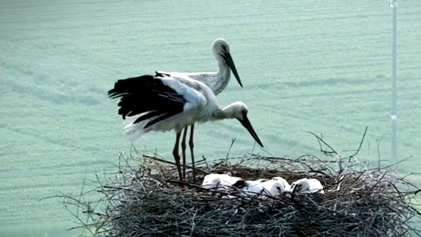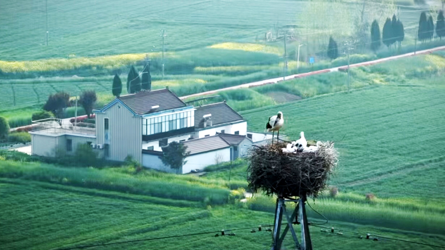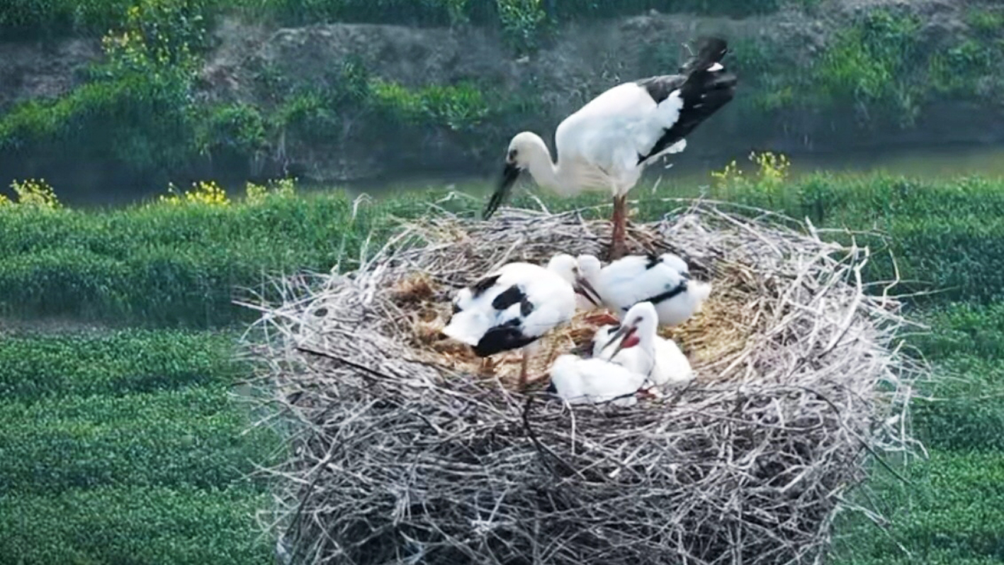 春日的江都真武,田野间小麦翠绿,金黄的油菜花肆意绽放。一处高压电线杆上,正上演着温馨动人的家园故事。通过航拍镜头清晰可见:4只国家一级保护动物东方白鹳幼鸟已然长大,活力满满;两只成年东方白鹳分工明确、悉心守护,或共同伫立巢边警惕四周,或轮番外出觅食、留守看护。