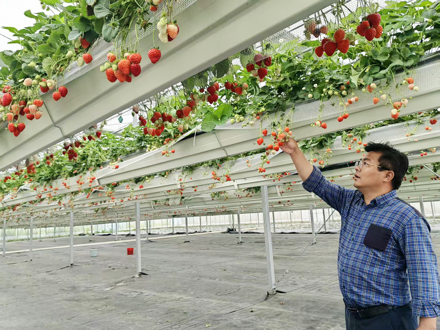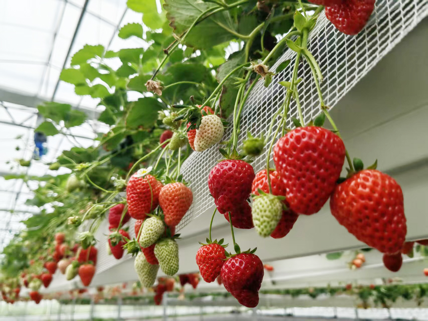“我们还会在草莓架下推出火锅、茶歇等,‘草莓+’会给大家带来更多不同的体验和感受。”祁贵仁介绍,架上草莓生长主要依靠营养土和水肥,通过手机操控来实现对草莓的“喂养”,每日“两餐”。根据确定好的时间,泵房会在上午、下午分别供应草莓“吃喝”,标准化的输送和丰富的营养可以确保草莓个头大小几乎一致、一茬接着一茬持续结果。