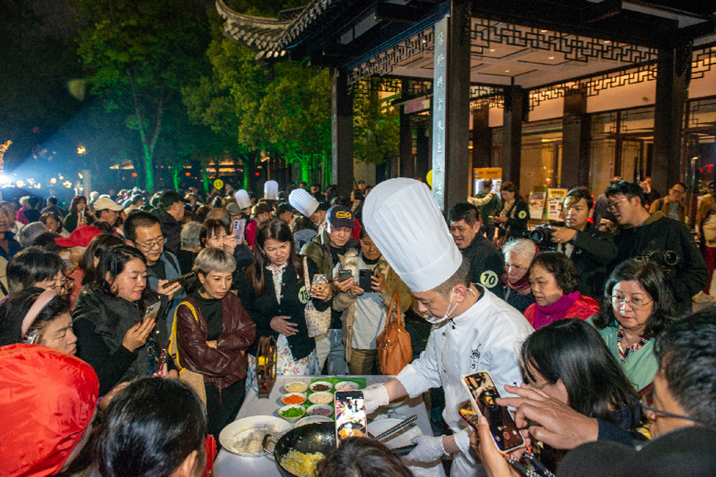 当晚,烟花三月“扬州美食嘉年华”晚宴在冶春御马头店拉开帷幕。盐水老鹅、熟醉大虾、水晶肴肉、五香熏鱼、扬州狮子头、鸡火煮干丝、八宝葫芦鸭……一道道经典淮扬菜次第上桌,令新加坡宾客啧啧称赞。席间,淮扬菜名厨现场展示了非遗面点、文思豆腐切丝、果蔬雕刻、扬州炒饭制作等精湛技艺。新加坡游客卓天山笑着对记者说:“扬州炒饭我在新加坡也吃过,但亲眼看到大师翻锅、配料,才知道正宗做法这么讲究。”现场掌声与赞叹声此起彼伏。