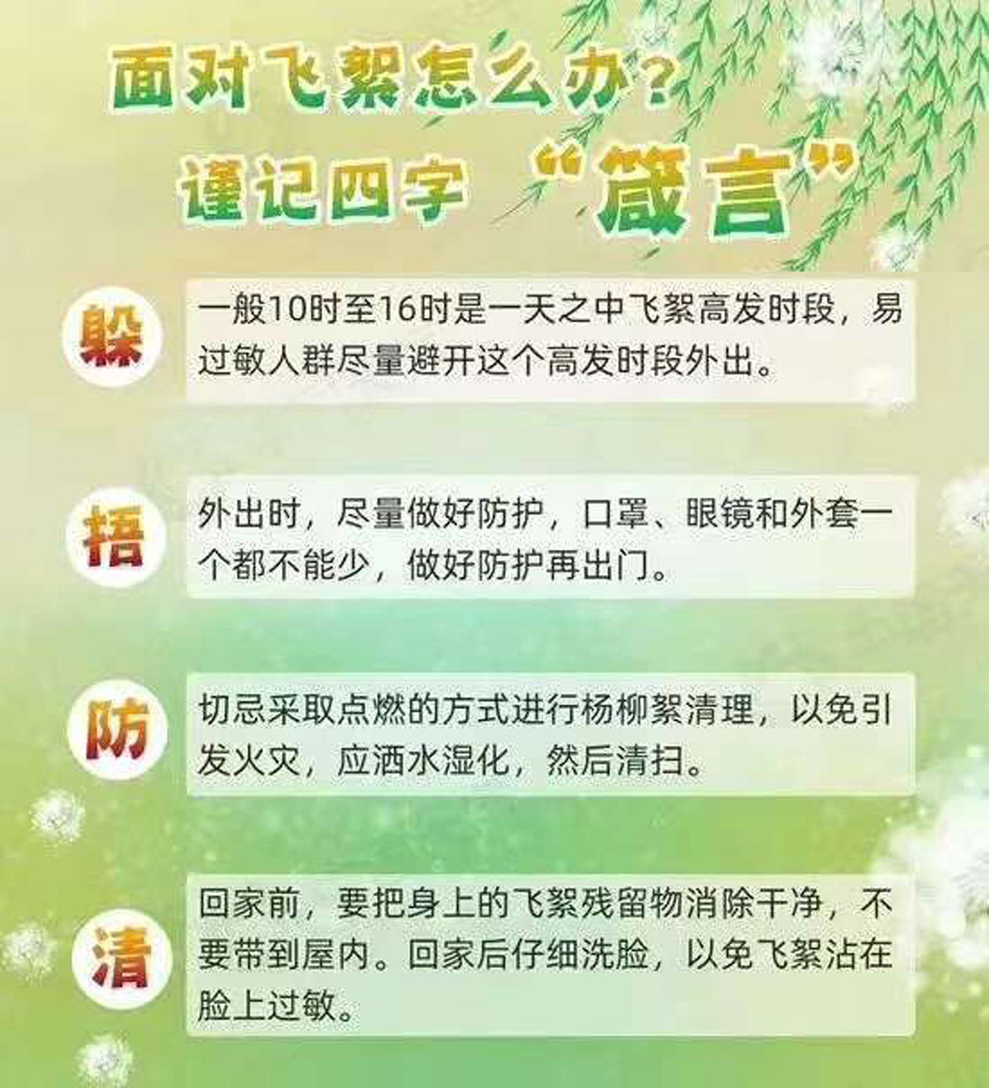 此外,还要特别提醒,柳絮漫天飞舞、无孔不入,不仅会给出行带来影响,还存在很大的火灾隐患,如不及时控制,很可能造成严重后果。